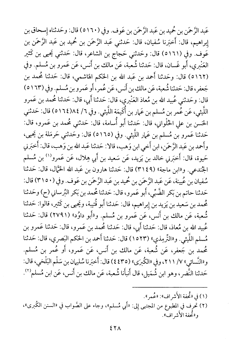 وفي ٧/ ٢١٢، وفي «الكبرى» (٤٤٣٦) قال: أخبرنا محمد بن عبد الله بن عبد الحكم، عن شعيب، قال: أنبأنا الليث، قال: حدثنا خالد بن يزيد، عن ابن أبي هلال، عن عَمرو بن مسلم. وفي ٧/ ٢١٢, وفي «الكبرى» (٤٤٣٨) قال: أخبرنا عبد الله بن محمد بن عبد الرَّحمَن، قال: حدثنا سفيان، قال: حدثني عبد الرَّحمَن بن حميد بن عبد الرَّحمَن بن عوف. و «أَبو يَعلى» (٦٩١٠) قال: حدثنا نصر بن علي، قال: حدثنا محمد بن أَبي عَدي، قال: حدثنا محمد بن عَمرو، عن عَمرو بن مسلم.