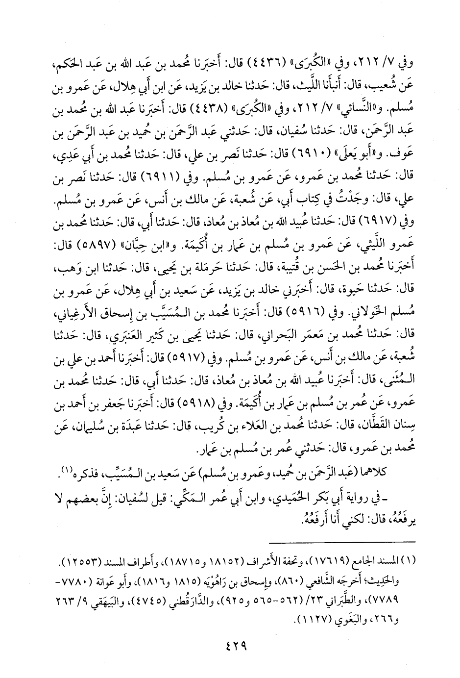 وفي (٦٩١١) قال: حدثنا نصر بن علي، قال: وجدت في كتاب أبي: عن شعبة، عن مالك بن أنس، عن عَمرو بن مسلم. وفي (٦٩١٧) قال: حدثنا عُبيد الله بن معاذ بن معاذ، قال: حدثنا أبي، قال: حدثنا محمد بن عَمرو الليثي، عن عَمرو بن مسلم بن عمار بن أكيمة. و «ابن حِبَّان» (٥٨٩٧) قال: أخبرنا محمد بن الحسن بن قتيبة، قال: حدثنا حَرملة بن يحيى، قال: حدثنا ابن وهب، قال: حدثنا حيوة، قال: أخبرني خالد بن يزيد، عن سعيد بن أبي هلال، عن عَمرو بن مسلم الخَولاني. وفي (٥٩١٦) قال: أخبرنا محمد بن المُسَيَّب بن إسحاق الأرغياني، قال: حدثنا محمد بن معمر البحراني، قال: حدثنا يحيى بن كثير العنبري، قال: حدثنا شعبة، عن مالك بن أنس، عن عَمرو بن مسلم. وفي (٥٩١٧) قال: أخبرنا أحمد بن علي بن المثنى، قال: أخبرنا عُبيد الله بن معاذ بن معاذ، قال: حدثنا أبي، قال: حدثنا محمد بن عَمرو، عن عمر بن مسلم بن عمار بن أكيمة. وفي (٥٩١٨) قال: أخبرنا جعفر بن أحمد بن سنان القطان، قال: حدثنا محمد بن العلاء بن كُريب، قال: حدثنا عَبدة بن سليمان، عن محمد بن عَمرو، قال: حدثني عمر بن مسلم بن عمار.
