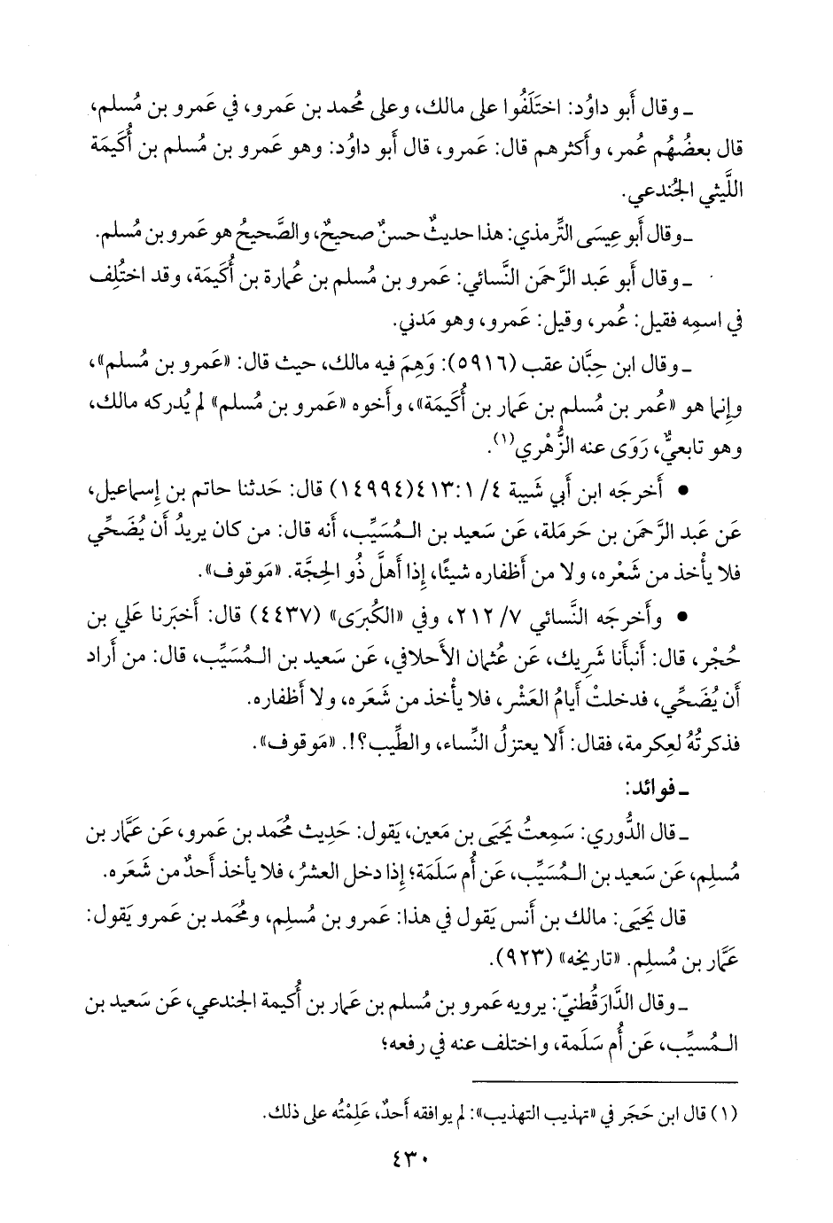 - قال عباس بن محمد الدوري: سمعت يحيى بن مَعين، يقول: حديث محمد بن عَمرو، عن عمار بن مسلم، عن سعيد بن المُسَيب، عن أُم سلمة؛ إذا دخل العشر، فلا يأخذ أحد من شعره.