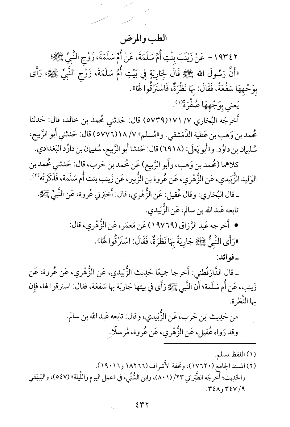 - قال الدارقُطني: أخرجا جميعا، يعني البخاري ومسلما، حديث الزبيدي، عن الزُّهْري، عن عروة، عن زينب، عن أُم سلمة؛ أن النبي صَلى الله عَليه وسَلم رأى في بيتها جارية بها سفعة، فقال: استرقوا لها، فإن بها النظرة.
