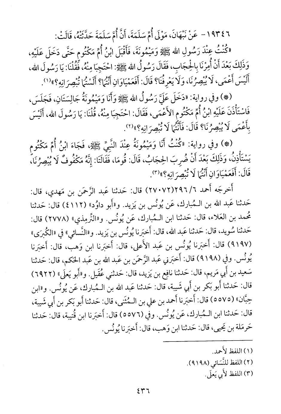 - وفي رواية: «دخل علي رسول الله صَلى الله عَليه وسَلم وأنا وميمونة جالستان، فجلس، فاستأذن عليه ابن أم مكتوم الأعمى، فقال: احتجبا منه، قلنا: يا رسول الله، أليس بأعمى لا يبصرنا؟ قال: فأنتما لا تبصرانه؟» (¬٢).