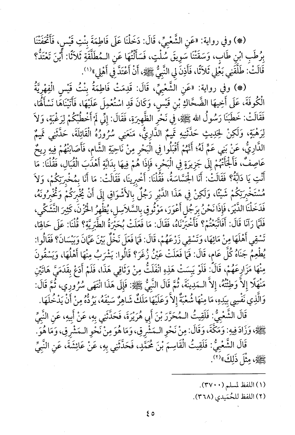 - وفي رواية: «عن الشعبي، قال: قدمت فاطمة بنت قيس الفهرية الكوفة، على أخيها الضحاك بن قيس، وكان قد استعمل عليها، فأتيناها نسألها، فقالت: خطبنا رسول الله صَلى الله عَليه وسَلم في نحر الظهيرة، فقال: إني لم أخطبكم لرغبة، ولا لرهبة، ولكن لحديث حدثنيه تميم الداري، منعني سروره القائلة، حدثني تميم الداري، عن بني عم له؛ أنهم أقبلوا في البحر من ناحية الشام، فأصابتهم فيه ريح عاصف، فألجأتهم إلى جزيرة في البحر، فإذا هم فيها بدابة أهدب القبال، فقلنا: ما أنت يا دابة؟ فقالت: أنا الجساسة، فقلنا: أخبرينا، فقالت: ما أنا بمخبرتكم، ولا مستخبرتكم شيئا، ولكن في هذا الدير رجل بالأشواق إلى أن يخبركم وتخبرونه، فدخلنا الدير، فإذا نحن برجل أعور، موثوق بالسلاسل، يظهر الحزن، كثير التشكي، فلما رآنا قال: أفاتبعتم؟ فأخبرناه، فقال: ما فعلت بحيرة الطبرية؟ قلنا: على حالها، تسقي أهلها من مائها، وتسقي زرعهم، قال: فما فعل نخل بين عمان وبيسان؟ فقالوا: يطعم جناه كل عام، قال: فما فعلت عين زغر؟ قالوا: يشرب منها أهلها، ويسقون منها مزارعهم، قال: فلو يبست هذه انفلت من وثاقي هذا، فلم أدع بقدمي هاتين منهلا إلا وطئته، إلا المدينة، ثم قال النبي صَلى الله عَليه وسَلم: فإلى هذا انتهى سروري، ثم قال: والذي نفسي بيده، ما منها شعبة إلا وعليها ملك شاهر سيفه، يرده من أن يدخلها.