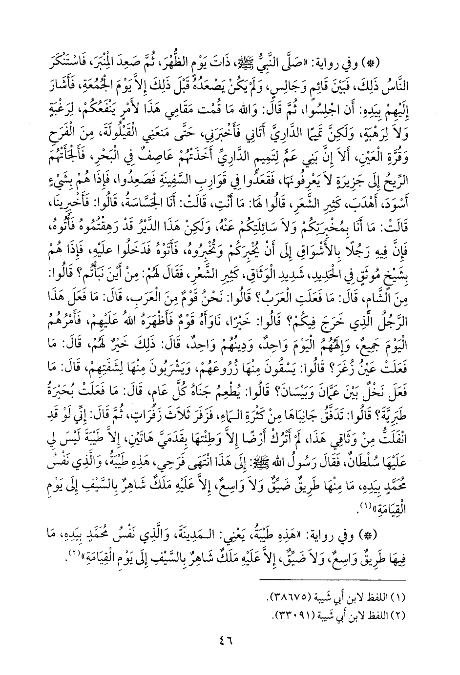 - وفي رواية: «صلى النبي صَلى الله عَليه وسَلم ذات يوم الظهر، ثم صعد المنبر، فاستنكر الناس ذلك، فبين قائم وجالس، ولم يكن يصعده قبل ذلك إلا يوم الجمعة، فأشار إليهم بيده: أن اجلسوا، ثم قال: والله ما قمت مقامي هذا لأمر ينفعكم، لرغبة ولا لرهبة، ولكن تميما الداري أتاني فأخبرني خبرًا منعني القيلولة، من الفرح وقرة العين، ألا إن بني عم لتميم الداري أخذتهم عاصف في البحر, فألجأتهم الريح إلى جزيرة لا يعرفونها، فقعدوا في قوارب السفينة فصعدوا، فإذا هم بشيء أسود، أهدب، كثير الشعر، قالوا لها: ما أنت، قالت: أنا الجساسة، قالوا: فأخبرينا، قالت: ما أنا بمخبرتكم ولا سائلتكم عنه، ولكن هذا الدير قد رهقتموه فأتوه، فإن فيه رجلا بالأشواق إلى أن يخبركم وتخبروه، فأتوه فدخلوا عليه، فإذا هم بشيخ موثق في الحديد، شديد الوثاق، كثير الشعر، فقال لهم: من أين نبأتم؟ قالوا: من الشام، قال: ما فعلت العرب؟ قالوا: نحن قوم من العرب، قال: ما فعل هذا الرجل الذي خرج فيكم؟ قالوا: خيرا، ناوأه قوم فأظهره الله عليهم، فأمرهم اليوم جميع، وإلههم اليوم واحد، ودينهم واحد، قال: ذلك خير لهم، قال: ما فعلت عين زغر؟ قالوا: يسقون منها زروعهم، ويشربون منها لشفتهم، قال: ما فعل نخل بين عمان وبيسان؟ قالوا: يطعم جناه كل عام، قال: ما فعلت بحيرة طبرية؟ قالوا: تدفق جانباها من كثرة الماء، فزفر ثلاث زفرات، ثم قال: إني لو قد انفلت من وثاقي هذا، لم أترك أرضا إلا وطئتها بقدمي هاتين، إلا طيبة ليس لي عليها سلطان، فقال رسول الله صَلى الله عَليه وسَلم: إلى هذا انتهى فرحي، هذه طيبة، والذي نفس محمد بيده، ما منها طريق ضيق ولا واسع، إلا عليه ملك شاهر بالسيف إلى يوم القيامة» (¬١).