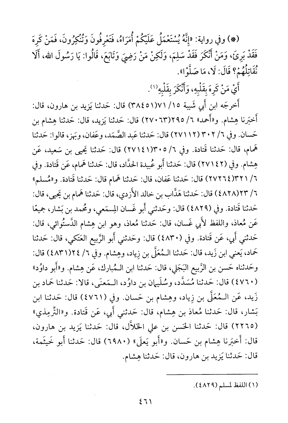 وفي ٦/ ٣٢١ (٢٧٢٦٤) قال: حدثنا عفان، قال: حدثنا همام قال: حدثنا قتادة. و «مسلم» ٦/ ٢٣ (٤٨٢٨) قال: حدثنا هداب بن خالد الأزدي، قال: حدثنا همام بن يحيى، قال: حدثنا قتادة. وفي (٤٨٢٩) قال: وحدثني أَبو غسان المسمعي، ومحمد بن بشار، جميعا عن معاذ، واللفظ لأبي غسان، قال: حدثنا معاذ، وهو ابن هشام الدَّستوائي، قال: حدثني أبي، عن قتادة. وفي (٤٨٣٠) قال: وحدثني أَبو الربيع العتكي، قال: حدثنا حماد، يعني ابن زيد، قال: حدثنا المُعَلَّى بن زياد، وهشام. وفي ٦/ ٢٤ (٤٨٣١) قال: وحدثناه حسن بن الربيع البَجَلي، قال: حدثنا ابن المبارك، عن هشام. و «أَبو داود» (٤٧٦٠) قال: حدثنا مُسدد، وسليمان بن داود، المعنى, قالا: حدثنا حماد بن زيد، عن المُعَلَّى بن زياد، وهشام بن حسان. وفي (٤٧٦١) قال: حدثنا ابن بشار، قال: حدثنا معاذ بن هشام، قال: حدثني أبي، عن قتادة. و «التِّرمِذي» (٢٢٦٥) قال: حدثنا الحسن بن علي الخَلَّال، قال: حدثنا يزيد بن هارون، قال: أخبرنا هشام بن حسان. و «أَبو يَعلى» (٦٩٨٠) قال: حدثنا أَبو خيثمة، قال: حدثنا يزيد بن هارون، قال: حدثنا هشام.