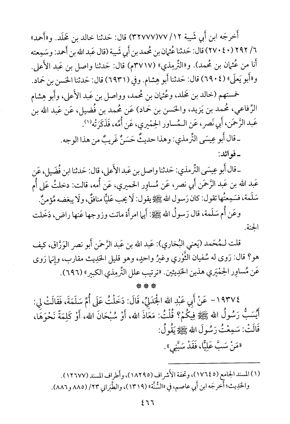 - قال التِّرمِذي: حدثنا واصل بن عبد الأعلى، قال: حدثنا ابن فضيل، عن عبد الله بن عبد الرَّحمَن أبي نصر، عن مساور الحميري، عن أمه، قالت: دخلت على أُم سلمة، فسمعتها تقول: كان رسول الله صَلى الله عَليه وسَلم يقول: لا يحب عليا منافق، ولا يبغضه مؤمن.