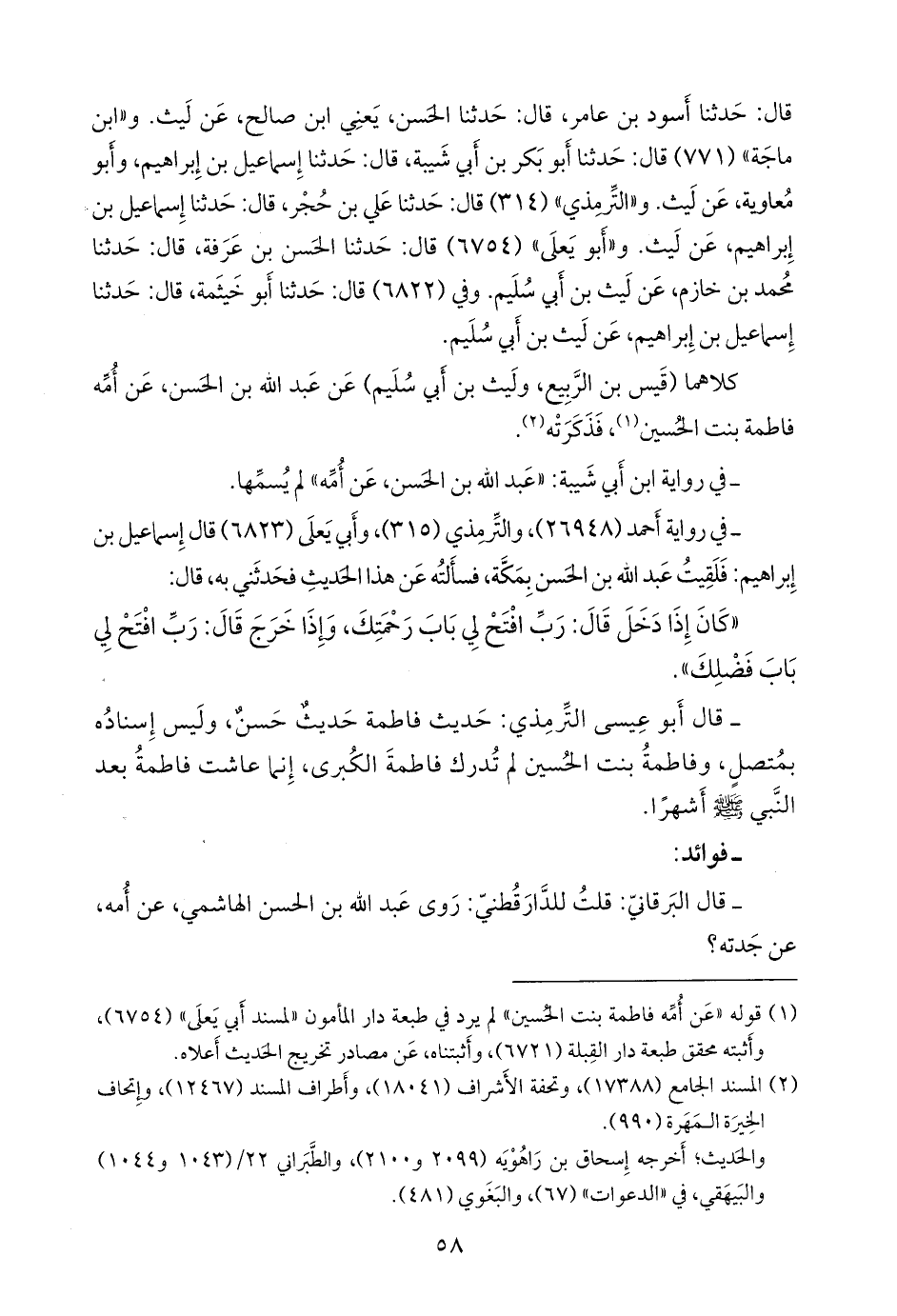 - في رواية أحمد (٢٦٩٤٨)، والتِّرمِذي (٣١٥)، وأبي يَعلى (٦٨٤٢) قال إسماعيل بن إبراهيم: فلقيت عبد الله بن الحسن بمكة، فسألته عن هذا الحديث فحدثني به، قال: