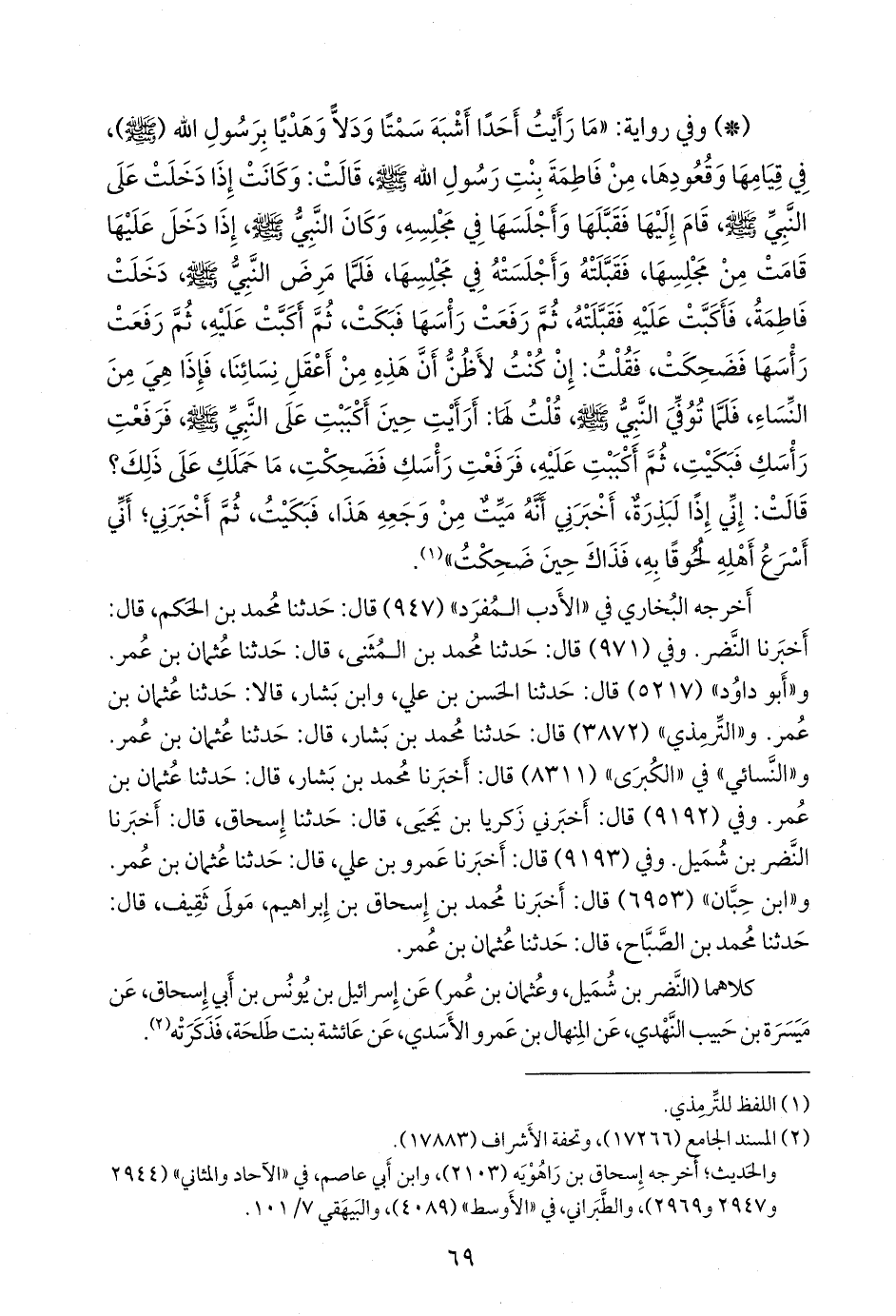 كلاهما (النضر بن شميل، وعثمان بن عمر) عن إسرائيل بن يونس بن أبي إسحاق، عن ميسرة بن حبيب النهدي، عن المنهال بن عَمرو الأسدي، عن عائشة بنت طلحة، فذكرته (¬٢).