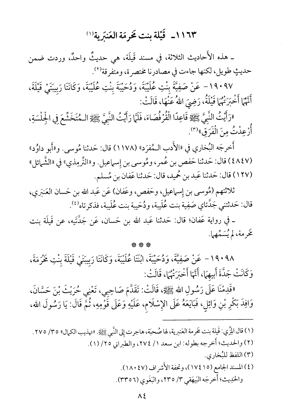 (¬١) قال المِزِّي: قيلة بنت مخرمة العنبرية، لها صحبة، هاجرت إلى النبي صَلى الله عَليه وسَلم. «تهذيب الكمال» ٣٥/ ٢٧٥.