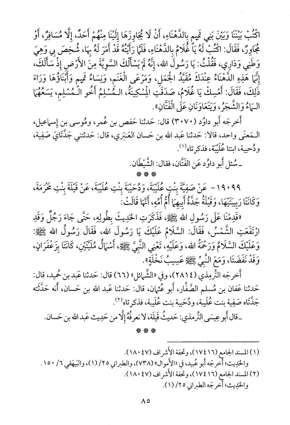أخرجه التِّرمِذي (٢٨١٤)، وفي «الشمائل» (٦٦) قال: حدثنا عَبد بن حُميد، قال: حدثنا عفان بن مسلم الصفار، أَبو عثمان، قال: حدثنا عبد الله بن حسان، أنه حدثته جدتاه صفية بنت عليبة، ودحيبة بنت عليبة، فذكرتاه (¬٢).