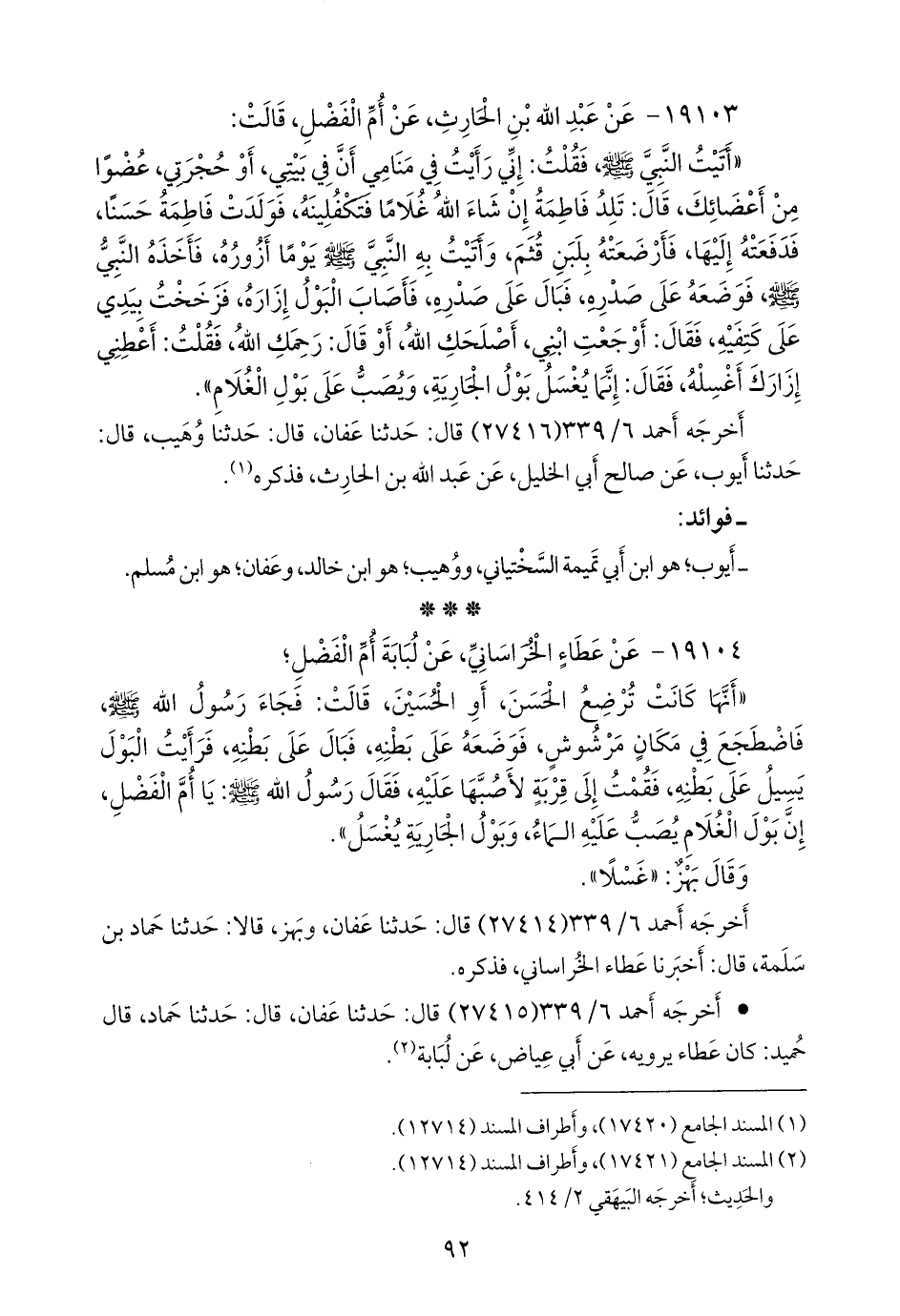 «أنها كانت ترضع الحسن، أو الحسين، قالت: فجاء رسول الله صَلى الله عَليه وسَلم فاضطجع في مكان مرشوش، فوضعه على بطنه، فبال على بطنه، فرأيت البول يسيل على بطنه، فقمت إلى قربة لأصبها عليه، فقال رسول الله صَلى الله عَليه وسَلم: يا أُم الفضل، إن بول الغلام يصب عليه الماء، وبول الجارية يغسل».