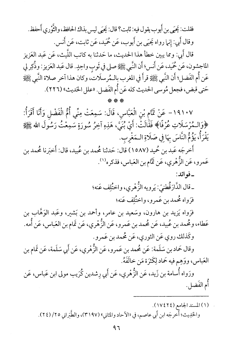 ١٩١٠٧ - عن تمام بن العباس، قال: سمعت مني أم الفضل وأنا أقرأ: {والمرسلات عرفا} فقالت: أي بني، هذه آخر سورة سمعت رسول الله صَلى الله عَليه وسَلم يقرأ، يؤم الناس بها في صلاة المغرب.