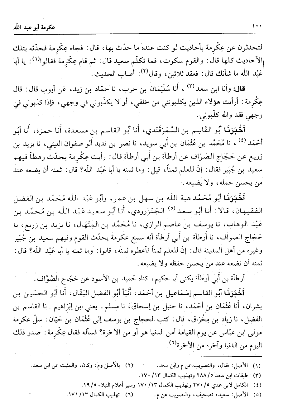 لتحدثون عن عكرمة بأحاديث لو كنت عنده ما حدث بها قال فجاء عكرمة فحدثه بتلك الأحاديث كلها قال والقوم سكوت فما تكلم سعيد قال ثم قام عكرمة فقالوا (1) يا أبا عبد الله ما شأنك قال فعقد ثلاثين وقال (2) أصاب الحديث قال وأنا ابن سعد (3) أنا سليمان بن حرب نا حماد بن زيد عن أيوب قال قال عكرمة أرأيت هؤلاء الذين يكذبونني من خلفي أو لا يكذبوني في وجهي فإذا كذبوني في وجهي فقد والله كذبوني أخبرنا أبو القاسم بن السمرقندي أنا أبو القاسم بن مسعدة أنا حمزة أنا أبو أحمد (4) نا محمد بن عثمان بن أبي سويد نا نصر بن قديد أبو صفوان الليثي نا يزيد بن زريع عن حجاج الصواف عن أرطأة بن أبي أرطأة قال رأيت عكرمة يحدث رهطا فيهم سعيد بن جبير فقال إن للعالم ثمنا قيل وما ثمنه يا أبا عبد الله قال ثمنه أن يضعه عند من يحسن حمله ولا يضيعه أخبرنا أبو محمد هبة الله بن سهل بن عمر وأبو عبد الله محمد بن الفضل الفقيهان قالا أنا أبو سعد (5) الجنزرودي أنا أبو سعيد عبد الله بن محمد بن عبد الوهاب نا يوسف بن عاصم الرازي نا محمد بن المنهال نا يزيد بن زريع نا حجاج الصواف نا أرطأة بن أبي أرطأة أنه سمع عكرمة يحدث القوم وفيهم سعيد بن جبير وغيره من أهل المدينة قال إن للعلم ثمنا فأعطوه ثمنه قالوا وما ثمنه يا أبا عبد الله قال ثمنه أن تضعه عند من يحسن حفظه ولا يضيعه أرطأة بن أرطأة يكنى أبا حكيم كناه حميد بن الأسود عن حجاج الصواف أخبرنا أبو القاسم إسماعيل بن أحمد أنبأ أبو الفضل البقال أنا أبو الحسين بن بشران أنا عثمان بن أحمد نا حنبل بن إسحاق نا مسلم يعني ابن إبراهيم نا القاسم بن الفضل نا زياد بن مخراق قال كتب الحجاج بن يوسف إلى عثمان بن حيان سل عكرمة مولى ابن عباس عن يوم القيامة أمن الدنيا هو أو من الآخرة فسأله فقال عكرمة صدر ذلك اليوم من الدنيا وآخره من الآخرة (6)