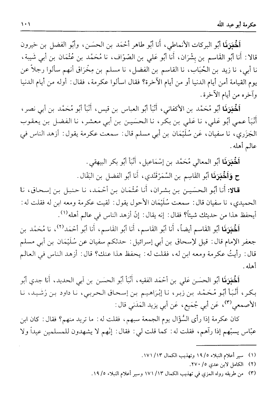 أخبرنا أبو البركات الأنماطي أنا أبو طاهر أحمد بن الحسن وأبو الفضل بن خيرون قالا أنا أبو القاسم بن بشران أنا أبو علي بن الصواف أنا محمد بن عثمان بن أبي شيبة نا أبي نا زيد بن الحباب نا القاسم بن الفضل نا مسلم بن مخراق أنهم سالوا رجلا عن يوم القيامة أمن أيام الدنيا أو من أيام الآخرة فقال اسألوا عكرمة فقال أوله من أيام الدنيا وآخره من أيام الآخرة أخبرنا أبو محمد بن الأكفاني أنبأ أبو العباس بن قيس أنبأ أبو محمد بن أبي نصر أنبأ عمي أبو علي نا علي بن بكر نا الحسين بن أبي معشر نا الفضل بن يعقوب الجزري أنا سفيان عن سليمان بن أبي مسلم قال سمعت عكرمة يقول أزهد الناس في عالم أهله أخبرنا أبو المعالي محمد بن إسماعيل أنبأ أبو بكر البيهقي ح وأخبرنا أبو القاسم بن السمرقندي أنا أبو الفضل بن البقال قالا أنا أبو الحسين بن بشران أنا عثمان بن أحمد نا حنبل بن إسحاق نا الحميدي أنا سفيان قال سمعت سليمان الأحول يقول لقيت عكرمة ومعه ابن له فقلت له أيحفظ هذا من حديثك شيئا فقال إنه يقال إن أزهد الناس في عالم أهله (1) أخبرنا أبو القاسم أيضا أنا أبو القاسم أنا أبو القاسم أنا أبو أحمد (2) نا محمد بن جعفر الإمام قال: قيل لإسحاق بن أبي إسرائيل حدثكم سفيان عن سليمان بن أبي مسلم قال رأيت عكرمة ومعه ابن له فقلت له يحفظ هذا عنك قال أزهد الناس في العالم أهله أخبرنا أبو الحسن علي بن أحمد الفقيه أنبأ أبو الحسن بن أبي الحديد أنا جدي أبو بكر أنبأ أبو محمد بن زبر أنا إبراهيم بن إسحاق الحربي أنا داود بن رشيد نا الأصمعي (3) عن أبي جميع عن أبي يزيد المدني قال كان عكرمة إذا رأى السؤال يوم الجمعة سبهم فقلت له ما تريد منهم فقال كان ابن عباس يسبهم إذا رآهم فقلت له كما قلت لي فقال إنهم لا يشهدون للمسلمين عيدا ولا
