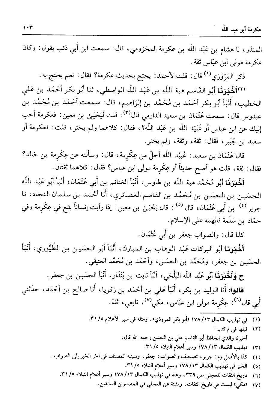 المنذر نا هشام بن عبد الله بن عكرمة المخزومي قال سمعت ابن أبي ذئب يقول وكان عكرمة مولى ابن عباس ثقة ذكر المروزي (1) قال قلت لأحمد يحتج بحديث عكرمة فقال نعم يحتج به (2) أخبرنا أبو القاسم هبة الله بن عبد الله الواسطي ثنا أبو بكر أحمد بن علي الخطيب أنبأ أبو بكر أحمد بن محمد بن إبراهيم قال سمعت أحمد بن محمد بن عبدوس قال سمعت عثمان بن سعيد الدارمي قال (3) قلت ليحيى بن معين فعكرمة أحب إليك عن ابن عباس أو عبيد الله بن عبد الله فقال كلاهما ولم يختر قلت فعكرمة أو سعيد بن جبير فقال ثقة وثقة ولم يختر قال عثمان بن سعيد عبيد الله أجل من عكرمة قال وسألته عن عكرمة بن خالد فقال ثقة قلت هو أصح حديثا أو عكرمة مولى ابن عباس فقال كلاهما ثقتان أخبرنا أبو محمد هبة الله بن طاوس أنبأ الغنائم بن أبي عثمان أنبأ أبو عبد الله الحسين بن الحسن بن محمد بن القاسم الغضائري أنا أحمد بن سلمان النجاد نا جرير (4) بن أبي عثمان قال (5) قال يحيى بن معين إذا رأيت إنسانا يقع في عكرمة وفي حماد بن سلمة فاتهمه على الإسلام كذا قال والصواب جعفر بن أبي عثمان أخبرنا أبو البركات عبد الوهاب بن المبارك أنبأ أبو الحسين بن الطيوري أنبأ الحسين بن جعفر ومحمد بن الحسن وأحمد بن محمد العتيقي ح وأخبرنا أبو عبد الله البلخي أنبأ ثابت بن بندار أنبأ الحسين بن جعفر قالوا أنا الوليد بن بكر أنبأ علي بن أحمد بن زكريا أنا صالح بن أحمد حدثني أبي قال (6) عكرمة مولى ابن عباس مكي (7) تابعي ثقة