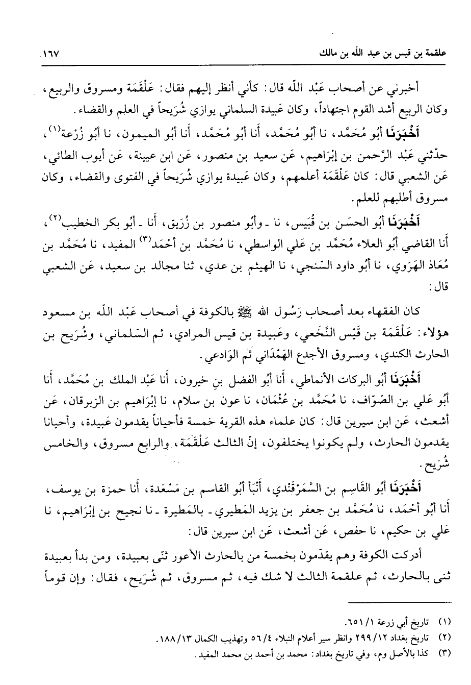 أخبرني عن أصحاب عبد الله قال كأني أنظر إليهم فقال علقمة ومسروق والربيع وكان الربيع أشد القوم اجتهادا وكان عبيدة السلماني يوازي شريحا في العلم والقضاء أخبرنا أبو محمد نا أبو محمد أنا أبو محمد أنا أبو الميمون نا أبو زرعة (1) حدثني عبد الرحمن بن إبراهيم عن سعيد بن منصور عن ابن عيينة عن أيوب الطائي عن الشعبي قال كان علقمة أعلمهم وكان عبيدة يوازي شريحا في الفتوى والقضاء وكان مسروق أطلبهم للعلم أخبرنا أبو الحسن بن قبيس نا وأبو منصور بن زريق أنا أبو بكر الخطيب (2) أنا القاضي أبو العلاء محمد بن علي الواسطي نا محمد بن أحمد (3) المفيد نا محمد بن معاذ الهروي نا أبو داود السنجي نا الهيثم بن عدي ثنا مجالد بن سعيد عن الشعبي قال كان الفقهاء بعد أصحاب رسول الله (صلى الله عليه وسلم) بالكوفة في أصحاب عبد الله بن مسعود هؤلاء علقمة بن قيس النخعي وعبيدة بن قيس المرادي ثم السلماني وشريح بن الحارث الكندي ومسروق الأجدع الهمداني ثم الوادعي أخبرنا أبو البركات الأنماطي أنا أبو الفضل بن خيرون أنا عبد الملك بن محمد أنا أبو علي بن الصواف نا محمد بن عثمان نا عون بن سلام نا إبراهيم بن الزبرقان عن أشعث عن ابن سيرين قال كان علماء هذه القرية خمسة فأحيانا يقدمون عبيدة وأحيانا يقدمون الحارث ولم يكونوا يختلفون إن الثالث علقمة والرابع مسروق والخامس شريح أخبرنا أبو القاسم بن السمرقندي أنبأ أبو القاسم بن مسعدة أنا حمزة بن يوسف أنا أبو أحمد نا محمد بن جعفر بن يزيد المطيري بالمطيرة نا نجيح بن إبراهيم نا علي بن حكيم نا حفص عن أشعث عن ابن سيرين قال أدركت الكوفة وهم يقدمون بخمسة من بالحارث الأعور ثني بعبيدة ومن بدأ بعبيدة ثني بالحارث ثم علقمة الثالث لا شك فيه ثم مسروق ثم شريح فقال وإن قوما