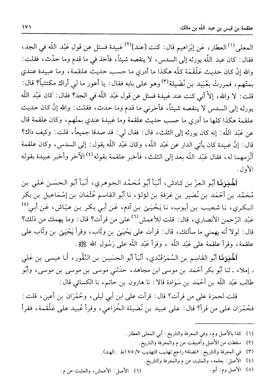 المعلى (1) العطار عن إبراهيم قال كنت عند (2) عبيدة فسئل عن قول عبد الله في الجد فقال كان عبد الله يورثه إلى السدس لا ينقصه شيئا فأخذ في ما قدم وما حدث فقلت والله إن كان حديث علقمة كله هكذا ما أدري ما حسب حديث علقمة وما عبيدة عندي بمتهم فمررت بعبيد بن نضيلة (3) وهو على بابه فقال يا أعور ما لي أراك مكتئبا قال قلت لا والله إلا أني كنت عند عبيدة فسئل عن قول عبد الله في الجد فقال كان عبد الله يورثه إلى السدس لا ينقصه شيئا فأخرني ما قدم وما حدث فقلت والله إن كان حديث علقمة هكذا كلها ما أدري ما حسب حديث علقمة وما عبيدة عندي بمتهم وكان علقمة قال عن عبد الله إنه كان يورثه إلى الثلث قال فقال لي قد صدقا جميعا قلت وكيف ذاك قال إن عبيدة كان يأتي الدار عن عبد الله وكان عبد الله يقول إلى السدس وكان علقمة ألزمهما له فقال عبد الله بعد إلى الثلث فأخبر علقمة بقوله (4) الآخر وأخبر عبيدة بقوله الأول أخبرنا أبو العز بن كادش أنبأ أبو محمد الجوهري أنبأ أبو الحسن علي بن محمد بن أحمد بن نصير بن عرفة بن لؤلؤ نا أبو القاسم عثمان بن إسماعيل بن بكر البكري نا شعيب بن أيوب نا يحيى بن آدم عن أبي بكر بن عياش عن أبي (5) عبد الرحمن الأنصاري قال قلت للأعمش (6) على من قرأت قال وما يهمك من ذلك قال لولا أنه يهمني ما سألتك قال قرأت على يحيى بن وثاب وقرأ يحيى بن وثاب على علقمة وقرأ علقمة على عبد الله وقرأ عبد الله على رسول الله (صلى الله عليه وسلم) أخبرنا أبو القاسم بن السمرقندي أنبأ أبو الحسين بن النقور أنا عيسى بن علي إملاء ثنا أبو بكر أحمد بن موسى ابن مجاهد حدثني موسى بن موسى بن موسى وأبو طالب عبد الله بن أحمد بن سوادة قالا نا هارون بن حاتم نا الكسائي قال قلت لحمزة على من قرأت قال قرأت على ابن أبي ليلى وحمران بن أعين قلت فحمران على من قرأ قال على عبيد بن نضيلة الخزاعي وقرأ عبيد على علقمة فقرأ