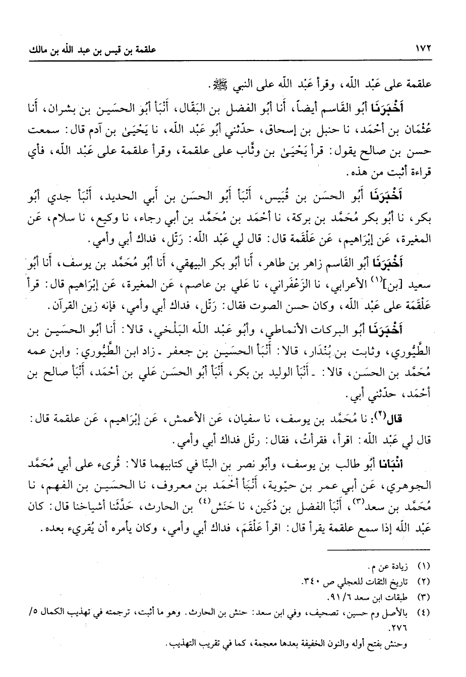 علقمة على عبد الله وقرأ عبد الله على النبي (صلى الله عليه وسلم) أخبرنا أبو القاسم أيضا أنا أبو الفضل بن البقال أنبأ أبو الحسين بن بشران أنا عثمان بن أحمد نا حنبل بن إسحاق حدثني أبو عبد الله نا يحيى بن آدم قال سمعت حسن بن صالح يقول قرأ يحيى بن وثاب على علقمة وقرأ علقمة على عبد الله فأي قراءة أثبت من هذه أخبرنا أبو الحسن بن قبيس أنبأ أبو الحسن بن أبي الحديد أنبأ جدي أبو بكر نا أبو بكر محمد بن بركة نا أحمد بن محمد بن أبي رجاء نا وكيع نا سلام عن المغيرة عن إبراهيم عن علقمة قال قال لي عبد الله رتل فداك أبي وأمي أخبرنا أبو القاسم زاهر بن طاهر أنا أبو بكر البيهقي أنا أبو محمد بن يوسف أنا أبو سعيد بن (1) الأعرابي نا الزعفراني نا علي بن عاصم عن المغيرة عن إبراهيم قال قرأ علقمة على عبد الله وكان حسن الصوت فقال رتل فداك أبي وأمي فإنه زين القرآن أخبرنا أبو البركات الأنماطي وأبو عبد الله البلخي قالا أنا أبو الحسين بن الطيوري وثابت بن بندار قالا أنبأ الحسين بن جعفر زاد ابن الطيوري وابن عمه محمد بن الحسن قالا أنبأ الوليد بن بكر أنبأ أبو الحسن علي بن أحمد أنبأ صالح بن أحمد حدثني أبي قال (2) نا محمد بن يوسف نا سفيان عن الأعمش عن إبراهيم عن علقمة قال قال لي عبد الله اقرأ فقرأت فقال رتل فداك أبي وأمي أنبأنا أبو طالب بن يوسف وأبو نصر بن البنا في كتابيهما قالا قرئ على أبي محمد الجوهري عن أبي عمر بن حيوية أنبأ أحمد بن معروف نا الحسين بن الفهم نا محمد بن سعد (3) أنبأ الفضل بن دكين نا حنش (4) بن الحارث حدثنا أشياخنا قال كان عبد الله إذا سمع علقمة يقرأ قال اقرأ علقم فداك أبي وأمي وكان يأمره أن يقرئ بعده