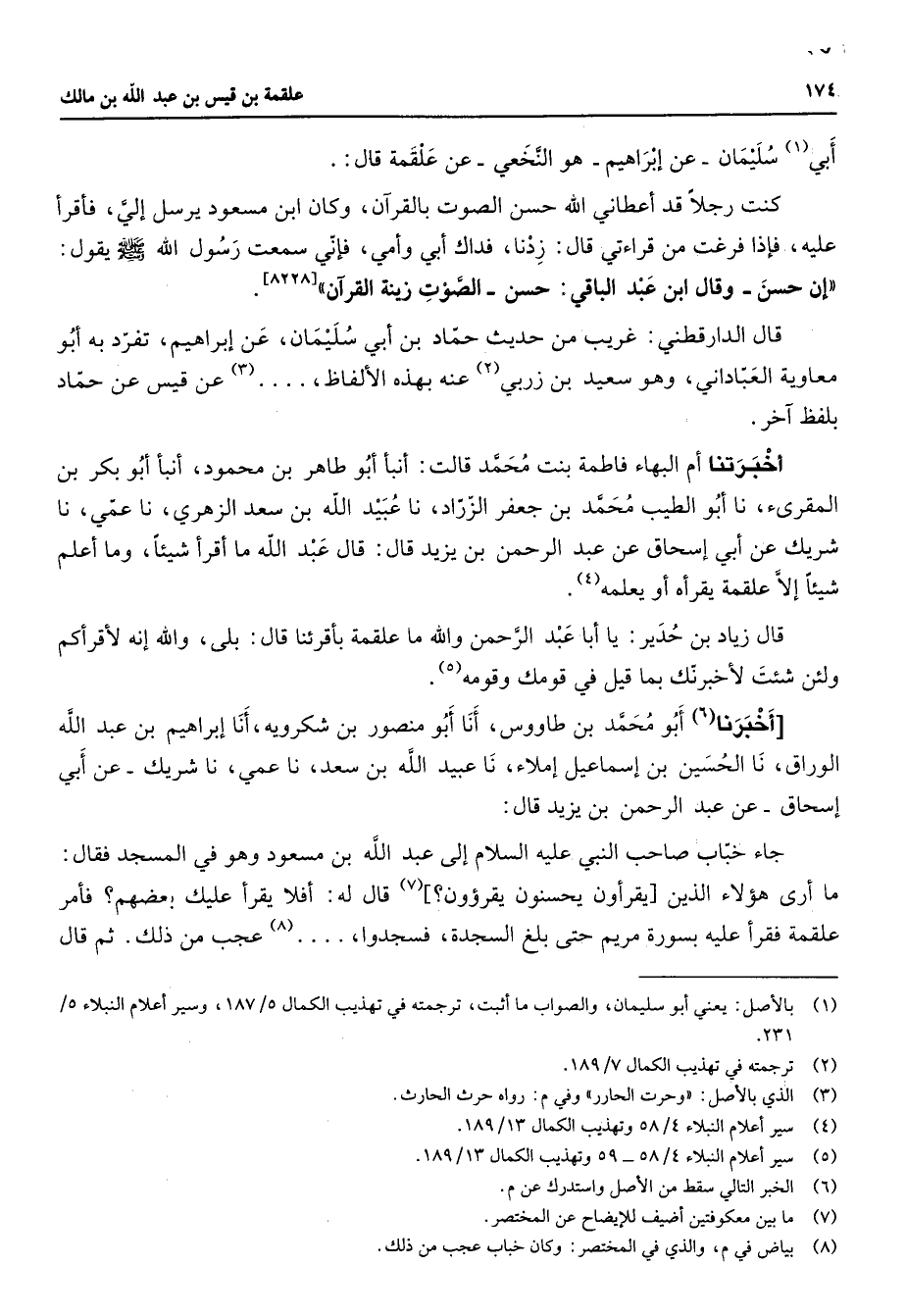[8228] قال الدارقطني غريب من حديث حماد بن أبي سليمان عن إبراهيم تفرد به أبو معاوية العباداني وهو سعيد بن زربي (2) عنه بهذه الألفاظ (3) عن قيس عن حماد بلفظ آخر أخبرتنا أم البهاء فاطمة بنت محمد قالت أنبأ أبو طاهر بن محمود أنبأ أبو بكر بن المقرئ نا أبو الطيب محمد بن جعفر الزراد نا عبيد الله بن سعد الزهري نا عمي نا شريك عن أبي إسحاق عن عبد الرحمن بن يزيد قال قال عبد الله ما أقرأ شيئا وما أعلم شيئا إلا علقمة يقرأه أو يعلمه (4) قال زياد بن حدير يا أبا عبد الرحمن والله ما علقمة بأقرئنا قال بلى والله إنه لأقرأكم ولئن شئت لأخبرنك بما قيل في قومك وقومه (5) أخبرنا (6) أبو محمد بن طاووس أنا أبو منصور بن شكرويه أنا إبراهيم بن عبد الله الوراق نا الحسين بن إسماعيل إملاء نا عبيد الله بن سعد نا عمي نا شريك عن أبي إسحاق عن عبد الرحمن بن يزيد قال جاء خباب صاحب النبي عليه السلام إلى عبد الله بن مسعود وهو في المسجد فقال ما أرى هؤلاء الذين يقرأون يحسنون يقرؤون (7) قال له أفلا يقرأ عليك بعضهم فأمر علقمة فقرأ عليه بسورة مريم حتى بلغ السجدة فسجدوا (8) عجب من ذلك ثم قال