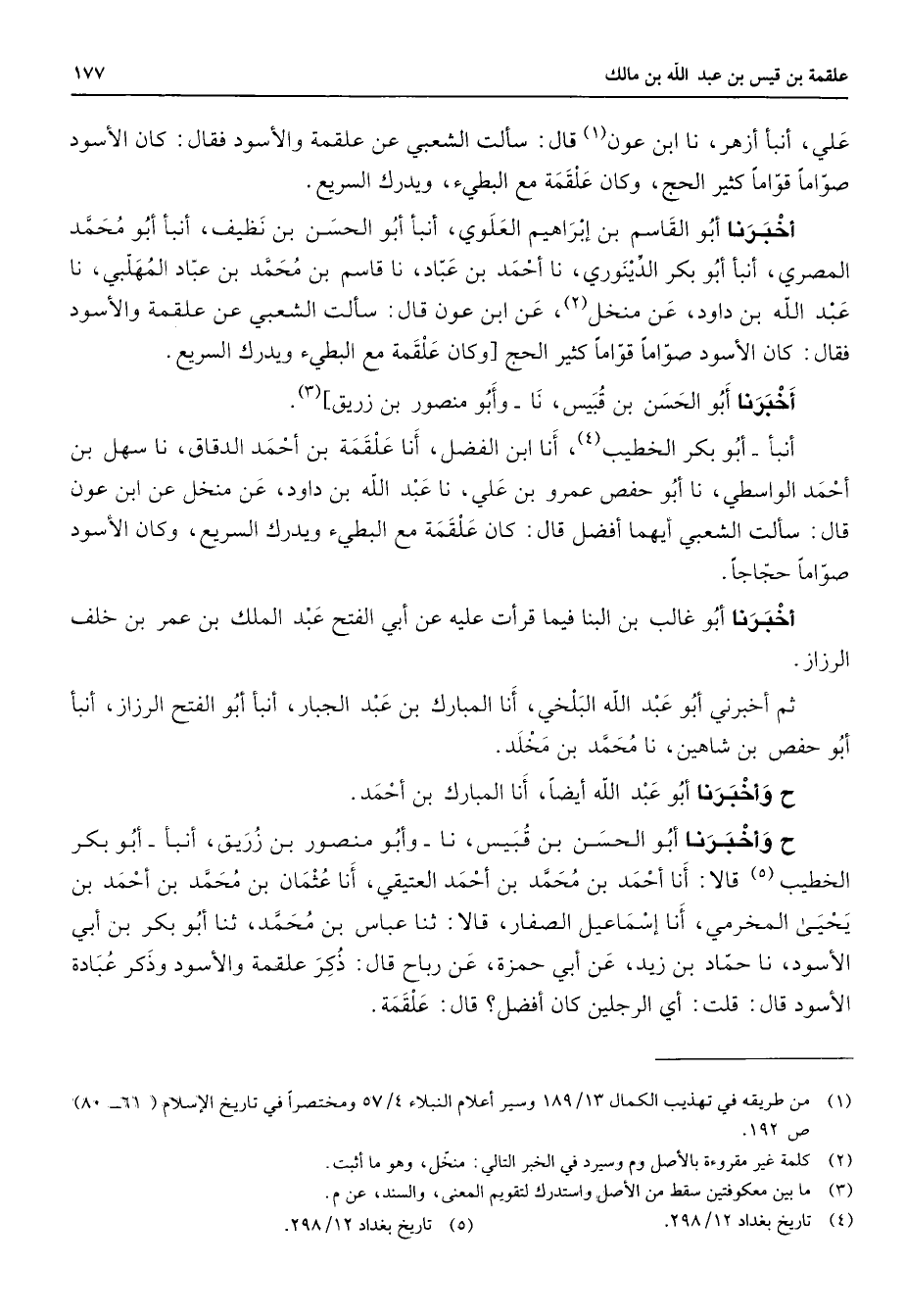 علي أنبأ أزهر نا ابن عون (1) قال سألت الشعبي عن علقمة والأسود فقال كان الأسود صواما قواما كثير الحج وكان علقمة مع البطئ ويدرك السريع أخبرنا أبو القاسم بن إبراهيم العلوي أنبأ أبو الحسن بن نظيف أنبأ أبو محمد المصري أنبأ أبو بكر الدينوري نا أحمد بن عباد نا قاسم بن محمد بن عباد المهلبي نا عبد الله بن داود عن منخل (2) عن ابن عون قال سألت الشعبي عن علقمة والأسود فقال كان الأسود صواما قواما كثير الحج وكان علقمة مع البطئ ويدرك السريع أخبرنا أبو الحسن بن قبيس نا وأبو منصور بن زريق (3) أنبأ أبو بكر الخطيب (4) أنا ابن الفضل أنا علقمة بن أحمد الدقاق نا سهل بن أحمد الواسطي نا أبو حفص عمرو بن علي نا عبد الله بن داود عن منخل عن ابن عون قال سألت الشعبي أيهما أفضل قال كان علقمة مع البطئ ويدرك السريع وكان الأسود صواما ججاجا أخبرنا أبو غالب بن البنا فيما قرأت عليه عن أبي الفتح عبد الملك بن عمر بن خلف الرزاز ثم أخبرني أبو عبد الله البلخي أنا المبارك بن عبد الجبار أنبأ أبو الفتح الرزاز أنبأ أبو حفص بن شاهين نا محمد بن مخلد ح وأخبرنا أبو عبد الله أيضا أنا المبارك بن أحمد ح وأخبرنا أبو الحسن بن قبيس نا وأبو منصور بن زريق أنبأ أبو بكر الخطيب (5) قالا أنا أحمد بن محمد بن أحمد العتيقي أنا عثمان بن محمد بن أحمد بن يحيى المخرمي أنا إسماعيل الصفار قالا ثنا عباس بن محمد ثنا أبو بكر بن أبي الأسود نا حماد بن زيد عن أبي حمزة عن رباح قال ذكر علقمة والأسود وذكر عبادة الأسود قال قلت أي الرجلين كان أفضل قال علقمة