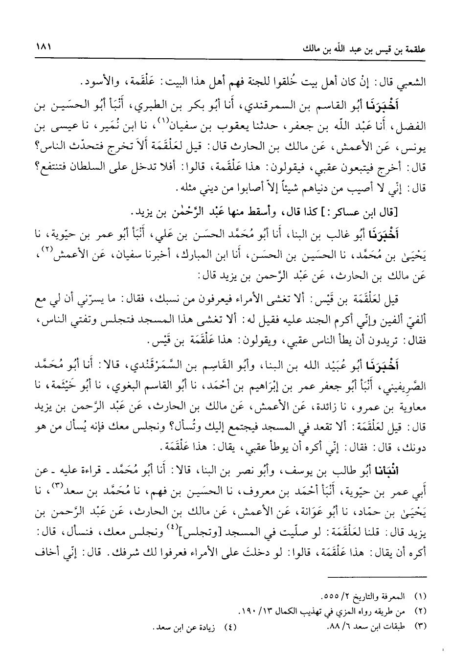 الشعبي قال إن كان أهل بيت خلقوا للجنة فهم أهل هذا البيت علقمة والأسود أخبرنا أبو القاسم بن السمرقندي أنا أبو بكر بن الطبري أنبأ أبو الحسين بن الفضل أنا عبد الله بن جعفر حدثنا يعقوب بن سفيان (1) أنا ابن نمير أنا عيسى بن يونس عن الأعمش عن مالك بن الحارث قال قيل لعلقمة ألا تخرج فتحدث الناس قال أخرج فيتبعون عقبي فيقولون هذا علقمة قالوا أفلا تدخل على السلطان فتنتفع قال إني لا أصيب من دنياهم شيئا إلا أصابوا من ديني مثله قال ابن عساكر كذا قال وأسقط منها عبد الرحمن بن يزيد أخبرنا أبو غالب بن البنا أنا أبو محمد الحسن بن علي أنبأ أبو عمر بن حيوية نا يحيى بن محمد نا الحسين بن الحسن أنا ابن المبارك أخبرنا سفيان عن الأعمش (2) عن مالك بن الحارث عن عبد الرحمن بن يزيد قال قيل لعلقمة بن قيس ألا تغشى الأمراء فيعرفون من نسبك فقال ما يسرني أن لي مع ألفي ألفين وإني أكرم الجند عليه فقيل له ألا تغشى هذا المسجد فتجلس وتفتي الناس فقال تريدون أن يطأ الناس عقبي ويقولون هذا علقمة بن قيس أخبرنا أبو عبيد الله بن البنا وأبو القاسم بن السمرقندي قالا أنا أبو محمد الصريفيني أنبأ أبو جعفر عمر بن إبراهيم بن أحمد نا أبو القاسم البغوي نا أبو خيثمة نا معاوية بن عمرو نا زائدة عن الأعمش عن مالك بن الحارث عن عبد الرحمن بن يزيد قال قيل لعلقمة ألا تقعد في المسجد فيجتمع إليك وتسأل ونجلس معك فإنه يسأل من هو دونك قال فقال إني أكره أن يوطأ عقبي يقال هذا علقمة أنبأنا أبو طالب بن يوسف وأبو نصر بن البنا قالا أنا أبو محمد قراءة عليه عن أبي عمر بن حيوية أنبأ أحمد بن معروف نا الحسين بن فهم نا محمد بن سعد (3) نا يحيى بن حماد نا أبو عوانة عن الأعمش عن مالك بن الحارث عن عبد الرحمن بن يزيد قال قلنا لعلقمة لو صليت في المسجد وتجلس (4) ونجلس معك فنسأل قال أكره أن يقال هذا علقمة قالوا لو دخلت على الأمراء فعرفوا لك شرفك قال إني أخاف