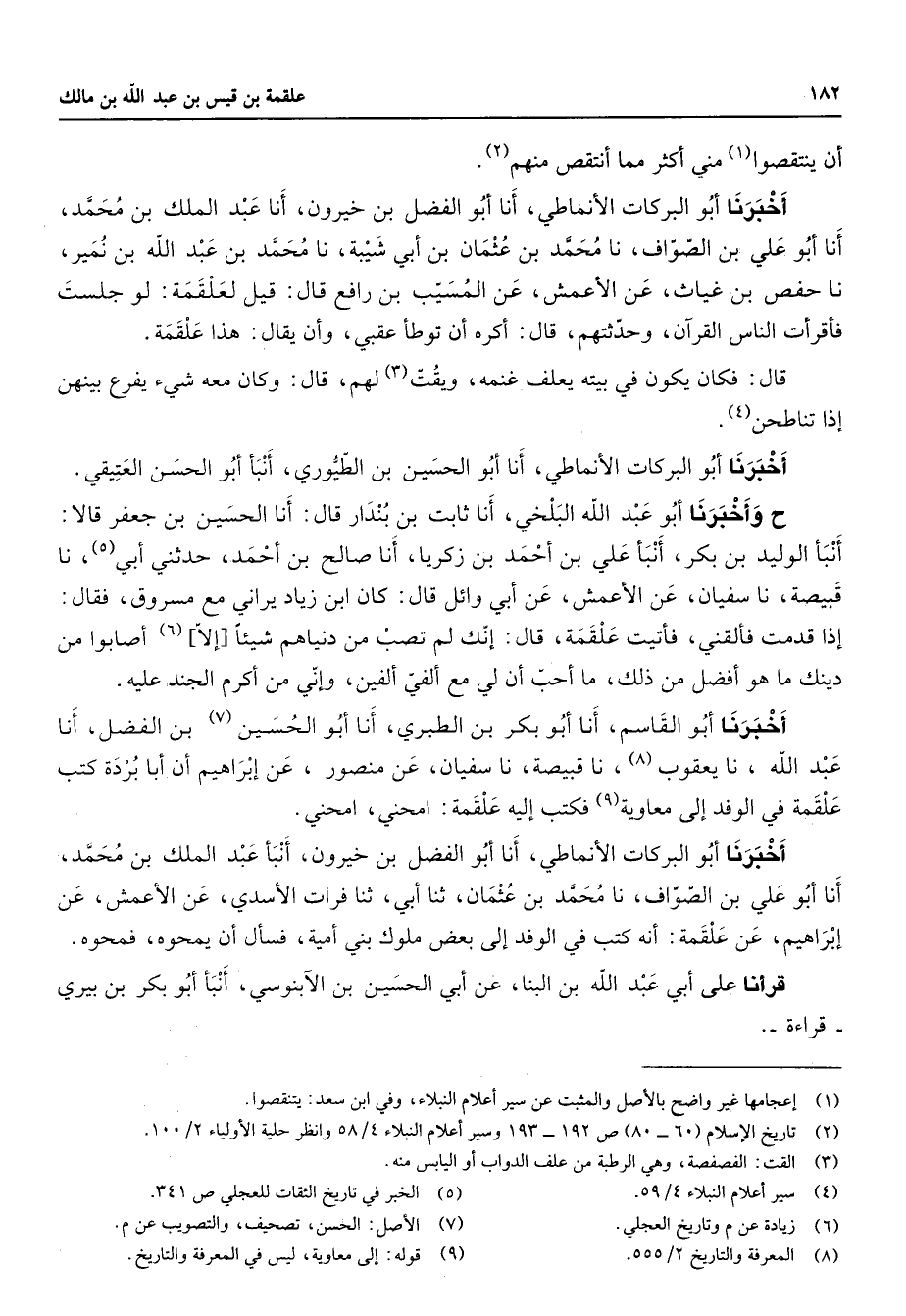 أن ينتقصوا (1) مني أكثر مما أنتقص منهم (2) أخبرنا أبو البركات الأنماطي أنا أبو الفضل بن خيرون أنا عبد الملك بن محمد أنا أبو علي بن الصواف نا محمد بن عثمان بن أبي شيبة نا محمد بن عبد الله بن نمير أنا حفص بن غياث عن الأعمش عن المسيب بن رافع قال قيل لعلقمة لو جلست فأقرأت الناس القرآن وحدثتهم قال أكره أن توطأ عقبي وأن يقال هذا علقمة قال فكان يكون في بيته يعلف غنمه ويقت (3) لهم قال وكان معه شئ يفرع بينهن إذا تناطحن (4) أخبرنا أبو البركات الأنماطي أنا أبو الحسين بن الطيوري أنبأ أبو الحسن العتيقي ح وأخبرنا أبو عبد الله البلخي أنا ثابت بن بندار قال أنا الحسين بن جعفر قالا أنبأ الوليد بن بكر أنبأ علي بن أحمد بن زكريا أنا صالح بن أحمد حدثني أبي (5) نا قبيصة نا سفيان عن الأعمش عن أبي وائل قال كان ابن زياد يراني مع مسروق فقال إذا قدمت فألقني فأتيت علقمة قال إنك لم تصب من دنياهم شيئا إلا (6) أصابوا من دينك ما هو أفضل من ذلك ما أحب أن لي مع ألفي ألفين وإني من أكرم الجند عليه أخبرنا أبو القاسم أنا أبو بكر بن الطبري أنا أبو الحسين (7) بن الفضل أنا عبد الله نا يعقوب (8) نا قبيصة نا سفيان عن منصور عن إبراهيم أن أبا بردة كتب علقمة في الوفد إلى معاوية (9) فكتب إليه علقمة امحني امحني أخبرنا أبو البركات الأنماطي أنا أبو الفضل بن خيرون أنبأ عبد الملك بن محمد أنا أبو علي بن الصواف نا محمد بن عثمان ثنا أبي ثنا فرات الأسدي عن الأعمش عن إبراهيم عن علقمة أنه كتب في الوفد إلى بعض ملوك بني أمية فسأل أن يمحوه فمحوه قرأنا على أبي عبد الله بن البنا عن أبي الحسين بن الآبنوسي أنبأ أبو بكر بن بيري قراءة