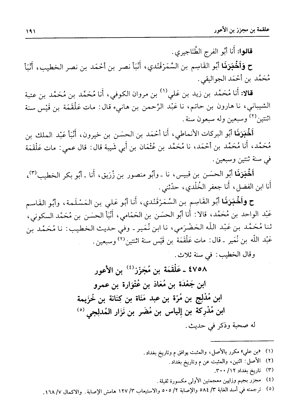 قالوا أنا أبو الفرج الطناجيري ح وأخبرنا أبو القاسم بن السمرقندي أنبأ نصر بن أحمد بن نصر الخطيب أنبأ محمد بن أحمد الجواليقي قالا أنا محمد بن زيد بن علي (1) بن مروان الكوفي أنا محمد بن محمد بن عتبة الشيباني نا هارون بن حاتم نا عبد الرحمن بن هانئ قال مات علقمة بن قيس سنة ثنتين (2) وسبعين وله سبعون سنة أخبرنا أبو البركات الأنماطي نا أحمد بن الحسن بن خيرون أنبأ عبد الملك بن محمد أنا محمد بن أحمد نا محمد بن عثمان بن أبي شيبة قال قال عمي مات علقمة في سنة اثنتين وسبعين أخبرنا أبو الحسن بن قبيس نا وأبو منصور بن زريق أنا أبو بكر الخطيب (3) أنا ابن الفضل أنا جعفر الخلدي حدثني ح وأخبرنا أبو القاسم بن السمرقندي أنا أبو علي بن المسلمة وأبو القاسم عبد الواحد بن محمد قالا أنا أبو الحسن بن الحمامي أنبأ الحسن بن محمد السكوني ثنا محمد بن عبد الله الحضرمي نا ابن نمير وفي حديث الخطيب نا محمد بن عبد الله بن نمير قال مات علقمة بن قيس سنة اثنتين (2) وسبعين وقال الخطيب في سنة ثلاث 4758 علقمة بن مجزز (4) بن الأعور ابن جعدة بن معاذ بن عتوارة بن عمرو ابن مدلج بن مرة بن عبد مناة بن كنانة بن خزيمة ابن مدركة بن إلياس بن مضر بن نزار المدلجي (5) له صحبة وذكر في حديث