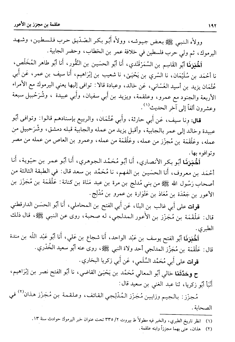 وولاه النبي (صلى الله عليه وسلم) بعض جيوشه وولاه أبو بكر الصديق حرب فلسطين وشهد اليرموك ثم ولي حرب فلسطين في خلافة عمر بن الخطاب وحضر الجابية أخبرنا أبو القاسم بن السمرقندي أنا أبو الحسين بن النقور أنا أبو طاهر المخلص نا أحمد بن سليمان نا السري بن يحيى نا شعيب بن إبراهيم أنا سيف بن عمر عن أبي عثمان يزيد بن أسيد الغساني عن خالد وعبادة قالا توافي إليها يعني اليرموك مع الأمراء الأربعة والجنود مع عمرو وعلقمة ويزيد بن أبي سفيان وأبي عبيدة وشرحبيل سبعة وعشرون ألفا إلى آخر الحديث (1) قال ونا سيف عن أبي حارثة وأبي عثمان والربيع بإسنادهم قالوا وتوافى أبو عبيدة وخالد إلى عمر بالجابية وأقبل يزيد من عمله والجابية قبله دمشق وشرحبيل من عمله وعلقمة بن مجزز من عمله وعلقمة من عمله وعمرو بن العاص من عمله من مصر وتوافوه بها أخبرنا أبو بكر الأنصاري أنا أبو محمد الجوهري أنا أبو عمر بن حيوية أنا أحمد بن معروف أنا الحسين بن الفهم نا محمد بن سعد قال في الطبقة الثالثة من أصحاب رسول الله (صلى الله عليه وسلم) من بني مدلج بن مرة بن عبد مناة بن كنانة علقمة بن مجزز بن الأعور بن جعدة بن معاذ بن عتوارة بن عمرو بن مدلج قرأت على أبي غالب بن البنا عن أبي الفتح بن المحاملي أنا أبو الحسن الدارقطني قال علقمة بن مجزز بن الأعور المدلجي له صحبة روى عن النبي (صلى الله عليه وسلم) قال ذلك الطبري أخبرنا أبو الفتح يوسف بن عبد الواحد أنا شجاع بن علي أنا أبو عبد الله بن مندة قال علقمة بن مجزز المدلجي أحد ولاة النبي (صلى الله عليه وسلم) روى عنه أبو سعيد الخدري قرأت على أبي محمد السلمي عن أبي زكريا البخاري ح وحدثنا خالي أبو المعالي محمد بن يحيى القاضي نا أبو الفتح نصر بن إبراهيم أنبأ أبو زكريا ثنا عبد الغني بن سعيد قال مجزز بالجيم وزايين مجزز المدلجي القائف وعلقمة بن مجزز هذان (2) في الصحابة