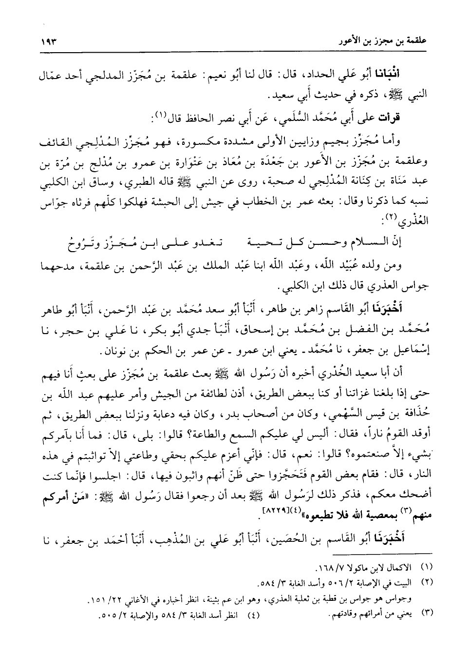 أنبأنا أبو علي الحداد قال قال لنا أبو نعيم علقمة بن مجزز المدلجي أحد عمال النبي (صلى الله عليه وسلم) ذكره في حديث أبي سعيد قرأت على أبي محمد السلمي عن أبي نصر الحافظ قال (1) وأما مجزز بجيم وزايين الأولى مشددة مكسورة فهو مجزز المدلجي القائف وعلقمة بن مجزز بن الأعور بن جعدة بن معاذ بن عتوارة بن عمرو بن مدلج بن مرة بن عبد مناة بن كنانة المدلجي له صحبة روى عن النبي (صلى الله عليه وسلم) قاله الطبري وساق ابن الكلبي نسبه كما ذكرنا وقال بعثه عمر بن الخطاب في جيش إلى الحبشة فهلكوا كلهم فرثاه جواس العذري (2) إن السلام وحسن تحية * تغدو على ابن مجزز وتروح ومن ولده عبيد الله وعبد الله ابنا عبد الملك بن عبد الرحمن بن علقمة مدحهما جواس العذري قال ذلك ابن الكلبي أخبرنا أبو القاسم زاهر بن طاهر أنبأ أبو سعد محمد بن عبد الرحمن أنبأ أبو طاهر محمد بن الفضل بن محمد بن إسحاق أنبأ جدي أبو بكر نا علي بن حجر نا إسماعيل بن جعفر نا محمد يعني ابن عمرو عن عمر بن الحكم بن نونان أن أبا سعيد الخدري أخبره أن رسول الله (صلى الله عليه وسلم) بعث علقمة بن مجزز على بعث أنا فيهم حتى إذا بلغنا غزاتنا أو كنا ببعض الطريق أذن لطائفة من الجيش وأمر عليهم عبد الله بن حذافة بن قيس السهمي وكان من أصحاب بدر وكان فيه دعابة ونزلنا ببعض الطريق ثم أوقد القوم نارا فقال أليس لي عليكم السمع والطاعة قالوا بلى قال فما أنا بآمركم بشيئ إلا صنعتموه قالوا نعم قال فإني أعزم عليكم بحقي وطاعتي إلا تواثبتم في هذه النار قال فقام بعض القوم فتحجزوا حتى ظن أنهم واثبون فيها قال اجلسوا فإنما كنت أضحك معكم فذكر ذلك لرسول الله (صلى الله عليه وسلم) بعد أن رجعوا فقال رسول الله (صلى الله عليه وسلم) من أمركم منهم (3) بمعصية الله فلا تطيعوه (4)