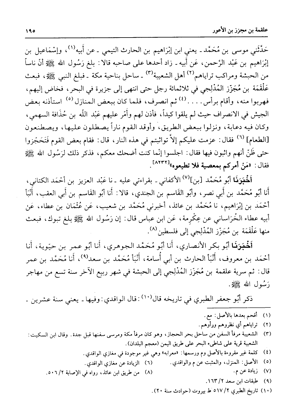 حدثني موسى بن محمد يعني ابن إبراهيم بن الحارث التيمي عن أبيه (1) وإسماعيل بن إبراهيم بن عبد الرحمن عن أبيه زاد أحدها على صاحبه قالا بلغ رسول الله (صلى الله عليه وسلم) أن ناسا من الحبشة ومراكب تراياهم (2) أهل الشعيبة (3) ساحل بناحية مكة فبلغ النبي (صلى الله عليه وسلم) فبعث علقمة بن مجزز المدلجي في ثلاثمائة رجل حتى انتهى إلى جزيرة في البحر فخاض إليهم فهربوا منه وأقام برأس (4) ثم انصرف فلما كان ببعض المنازل (5) استأذنه بعض الجيش في الانصراف حيث لم يلقوا كيدا فأذن لهم وأمر عليهم عبد الله بن حذافة السهمي وكان فيه دعابة ونزلوا ببعض الطريق وأوقد القوم نارا يصطلون عليها ويصطنعون الطعام (6) فقال عزمت عليكم إلا تواثبتم في هذه النار قال فقام بعض القوم فتحجزوا حتى ظن أنهم واثبون فيها فقال اجلسوا إنما كنت أضحك معكم فذكر ذلك لرسول الله (صلى الله عليه وسلم) فقال من أمركم بمعصية فلا تطيعوه