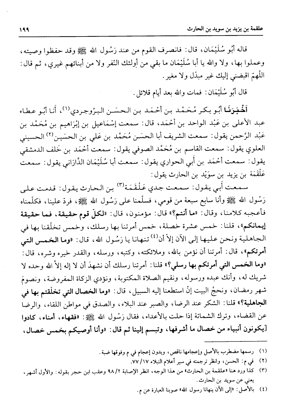 قاله أبو سليمان قال فانصرف القوم من عند رسول الله (صلى الله عليه وسلم) وقد حفظوا وصيته وعملوا بها ولا والله يا أبا سليمان ما بقي من أولئك النفر ولا من أبنائهم غيري ثم قال اللهم اقبضني إليك غير مبدل ولا مغير قال أبو سليمان فمات والله بعد أيام قلائل أخبرنا أبو بكر محمد بن أحمد بن الحسن البروجردي (1) أنا أبو عطاء عبد الأعلى بن عبد الواحد بن أحمد قال سمعت إسماعيل بن إبراهيم بن محمد بن عبد الرحمن يقول سمعت الشريف أبا الحسن محمد بن علي بن الحسين (2) الحسيني العلوي يقول سمعت القاسم بن محمد الصوفي يقول سمعت أحمد بن خلف الدمشقي يقول سمعت أحمد بن ابي الحواري يقول سمعت أبا سليمان الداراني يقول سمعت علقمة بن يزيد بن سويد بن الحارث يقول سمعت أبي يقول سمعت جدي علقمة (3) بن الحارث يقول قدمت على رسول الله (صلى الله عليه وسلم) وأنا سابع سبعة من قومي فسلمنا على رسول الله (صلى الله عليه وسلم) فرد علينا فكلمناه فأعجبه كلامنا وقال ما أنتم؟ قال مؤمنون قال لكل قوم حقيقة فما حقيقة إيمانكم قلنا خمس عشرة خصلة خمس أمرتنا بها رسلك وخمس تخلقنا بها في الجاهلية ونحن عليها إلى الآن إلا أن (4) تنهانا يا رسول الله قال وما الخمس التي أمرتكم قال أمرتنا أن نؤمن بالله وملائكته وكتبه ورسله والقدر خيره وشره قال وما الخمس التي أمرتكم بها رسلي قلنا أمرتنا رسلك أن نشهد أن لا إله إلا الله وحده لا شريك له وأنك عبده ورسوله ونقيم الصلاة المكتوبة ونؤدي الزكاة المفروضة ونصوم شهر رمضان ونحج البيت إن استطعنا إليه السبيل قال وما الخصال التي تخلقتم بها في الجاهلية؟ قلنا الشكر عند الرضا والصبر عند البلاء والصدق في مواطن اللقاء والرضا عن القضاء وترك الشماتة إذا حلت بالأعداء فقال رسول الله (صلى الله عليه وسلم) فقهاء أمناء كادوا أن يكونون أنبياء من خصال ما أشرفها وتبسم إلينا ثم قال وأنا أوصيكم بخمس خصال
