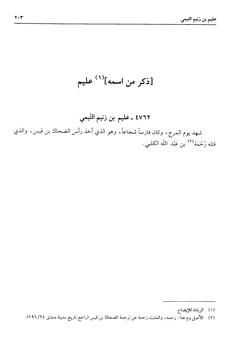 4762 - عليم بن زنيم التيمي شهد يوم المرج وكان فارسا شجاعا وهو الذي أخذ راس الضحاك بن قيس والذي قتله زحمة (2) بن عبد الله الكلبي