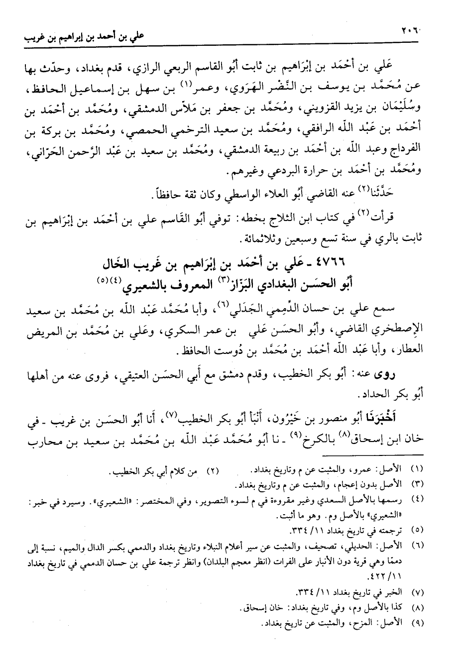 4766 - علي بن أحمد بن إبراهيم بن غريب الخال أبو الحسن البغدادي البزاز (3) المعروف بالشعيري (4) (5) سمع علي بن حسان الدممي الجدلي (6) وأبا محمد عبد الله بن محمد بن سعيد الإصطخري القاضي وأبو الحسن علي بن عمر السكري وعلي بن محمد بن المريض العطار وأبا عبد الله أحمد بن محمد بن دوست الحافظ روى عنه أبو بكر الخطيب وقدم دمشق مع أبي الحسن العتيقي فروى عنه من أهلها أبو بكر الحداد أخبرنا أبو منصور بن خيرون أنبأ أبو بكر الخطيب (7) أنا أبو الحسن بن غريب في خان ابن إسحاق (8) بالكرخ (9) نا أبو محمد عبد الله بن محمد بن سعيد بن محارب