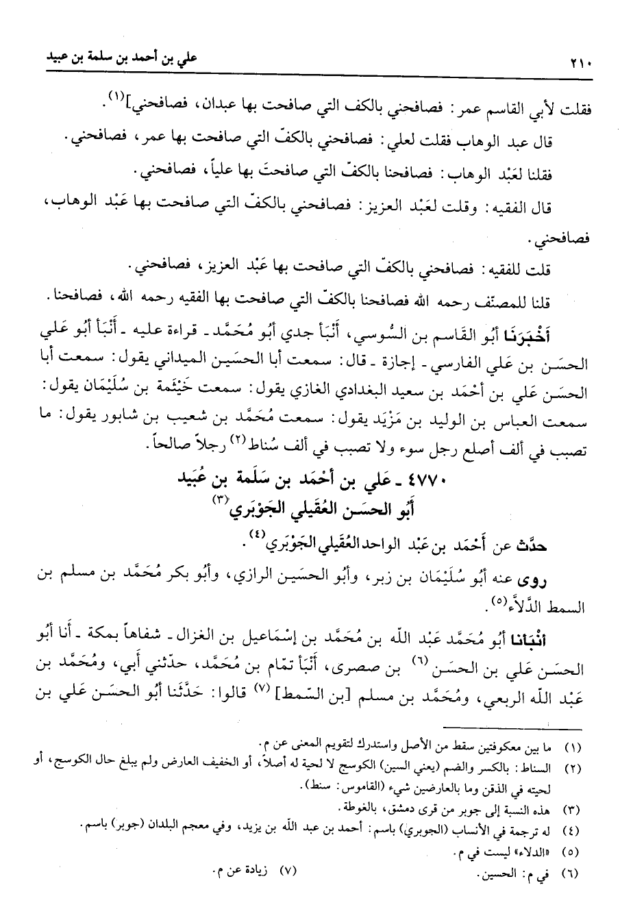 فقلت لأبي القاسم عمر فصافحني بالكف التي صافحت بها عبدان فصافحني (1) قال عبد الوهاب فقلت لعلي فصافحني بالكف التي صافحت بها عمر فصافحني فقلنا لعبد الوهاب فصافحنا بالكف التي صافحت بها عليا فصافحني قال الفقيه وقلت لعبد العزيز فصافحني بالكف التي صافحت بها عبد الوهاب فصافحني قلت للفقيه فصافحني بالكف التي صافحت بها عبد العزيز فصافحني قلنا للمصنف رحمه الله فصافحنا بالكف التي صافحت بها الفقيه رحمه الله فصافحنا أخبرنا أبو القاسم بن السوسي أنبأ جدي أبو محمد قراءة عليه أنبأ أبو علي الحسن بن علي الفارسي إجازة قال سمعت أبا الحسين الميداني يقول سمعت أبا الحسن علي بن أحمد بن سعيد البغدادي الغازي يقول سمعت خيثمة بن سليمان يقول سمعت العباس بن الوليد بن مزيد يقول سمعت محمد بن شعيب بن شابور يقول ما تصبب في ألف أصلع رجل سوء ولا تصبب في ألف سناط (2) رجلا صالحا
