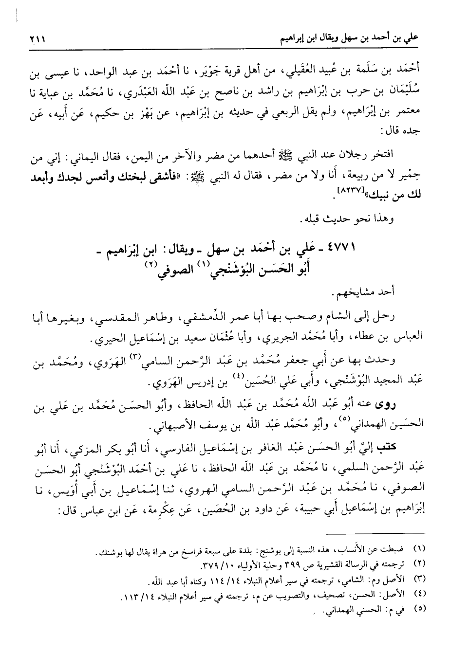 4771 - علي بن أحمد بن سهل ويقال ابن إبراهيم أبو الحسن البوشنجي (1) الصوفي (2) أحد مشايخهم رحل إلى الشام وصحب بها أبا عمر الدمشقي وطاهر المقدسي وبغيرها أبا العباس بن عطاء وأبا محمد الجريري وأبا عثمان سعيد بن إسماعيل الحيري وحدث بها عن أبي جعفر محمد بن عبد الرحمن السامي (3) الهروي ومحمد بن عبد المجيد البوشنجي وأبي علي الحسين (4) بن إدريس الهروي روى عنه أبو عبد الله محمد بن عبد الله الحافظ وأبو الحسن محمد بن علي بن الحسين الهمداني (5) وأبو محمد عبد الله بن يوسف الأصبهاني كتب إلي أبو الحسن عبد الغافر بن إسماعيل الفارسي أنا أبو بكر المزكي أنا أبو عبد الرحمن السلمي نا محمد بن عبد الله الحافظ نا علي بن أحمد البوشنجي أبو الحسن الصوفي نا محمد بن عبد الرحمن السامي الهروي ثنا إسماعيل بن أبي أويس أنا إبراهيم بن إسماعيل أبي حبيبة عن داود بن الحصين عن عكرمة عن ابن عباس قال
