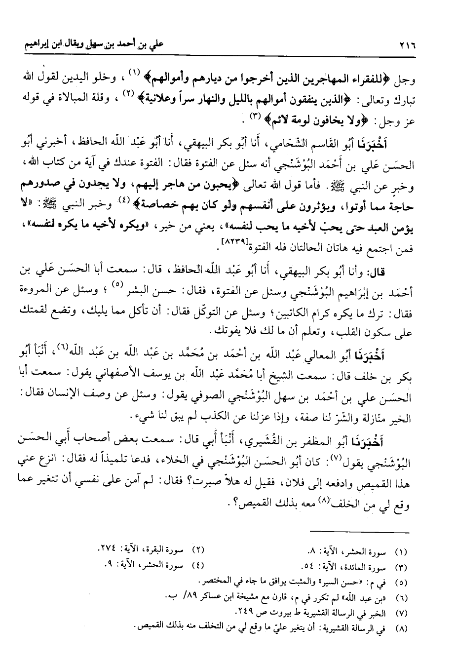 وجل " للفقراء المهاجرين الذين أخرجوا من ديارهم وأموالهم " (1) وخلو اليدين لقول الله تبارك وتعالى " الذين ينفقون أموالهم بالليل والنهار سرا وعلانية " (2) وقلة المبالاة في قوله عز وجل " ولا يخافون لومة لائم " (3) أخبرنا أبو القاسم الشحامي أنا أبو بكر البيهقي أنا أبو عبد الله الحافظ أخبرني أبو الحسن علي بن أحمد البوشنجي أنه سئل عن الفتوة فقال الفتوة عندك في آية من كتاب الله وخبر عن النبي (صلى الله عليه وسلم) فأما قول الله تعالى " يحبون من هاجر إليهم ولا يجدون في صدورهم حاجة مما أوتوا ويؤثرون على أنفسهم ولو كان بهم خصاصة " (4) وخبر النبي (صلى الله عليه وسلم) لا يؤمن العبد حتى يحب لأخيه ما يحب لنفسه يعني من خير ويكره لأخيه ما يكره لنفسه فمن اجتمع فيه هاتان الحالتان فله الفتوة