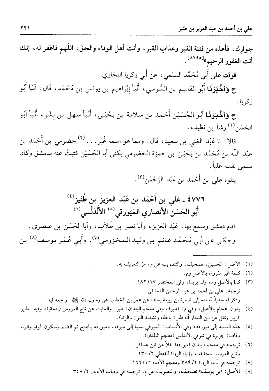 4776 - علي بن أحمد بن عبد العزيز بن طنيز (4) أبو الحسن الأنصاري الميورقي (5) الأندلسي (6) قدم دمشق وسمع بها عبد العزيز وأبا نصر بن طلاب وأبا الحسن بن صصرى وحكى عن أبي محمد غانم بن وليد المخزومي (7) وأبي عمر يوسف (8) بن