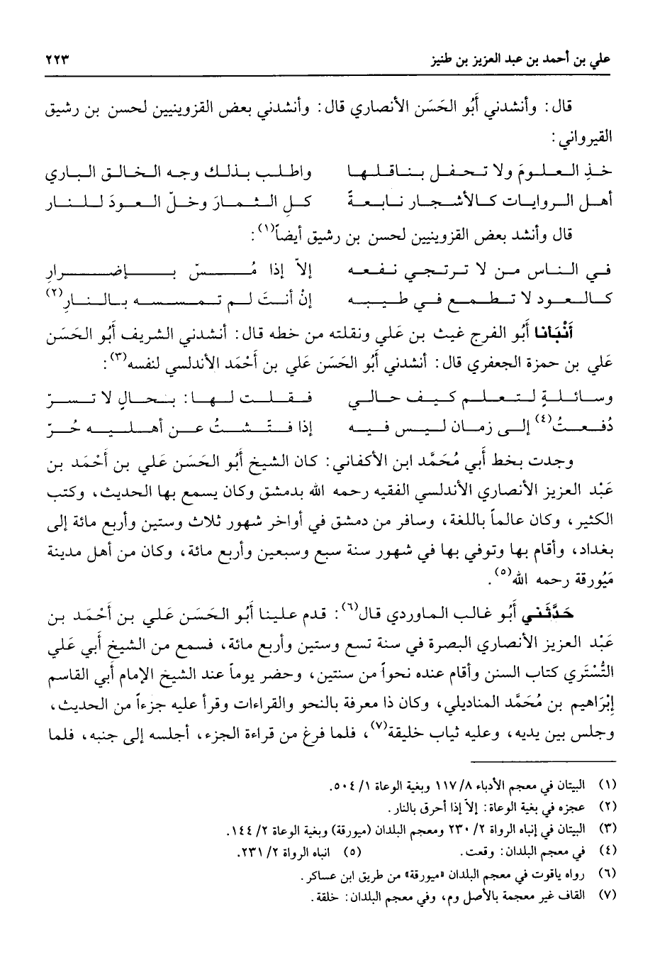 قال وأنشدني أبو الحسن الأنصاري قال وأنشدني بعض القزوينيين لحسن بن رشيق القيرواني خذ العلوم ولا تحفل بناقلها * واظلب بذلك وجه الخالق الباري أهل الروايات كالأشجار نابعة * كل الثمار وخل العود للنار قال وأنشد بعض القزوينيين لحسن بن رشيق أيضا (1) في الناس من لا ترتجي نفعه * إلا إذا مس بإضرار كالعود لا تطمع في طيبه * إن أنت لم تمسسه بالنار (2) أنبأنا أبو الفرج غيث بن علي ونقلته من خطه قال أنشدني الشريف أبو الحسن علي بن حمزة الجعفري قال أنشدني أبو الحسن علي بن أحمد الأندلسي لنفسه (3) وسائلة لتعلم كيف حالي * فقلت لها بحال لا تسر دفعت (4) إلى زمان ليس فيه * إذا فتشت عن أهليه حر وجدت بخط أبي محمد ابن الأكفاني كان الشيخ أبو الحسن علي بن أحمد بن عبد العزيز الأنصاري الأندلسي الفقيه رحمه الله بدمشق وكان يسمع بها الحديث وكتب الكثير وكان عالما باللغة وسافر من دمشق في أواخر شهور ثلاث وستين وأربع مائة إلى بغداد وأقام بها وتوفي بها في شهور سنة سبع وسبعين وأربع مائة وكان من أهل مدينة ميورقة رحمه الله (5) حدثني أبو غالب الماوردي قال (6) قدم علينا أبو الحسن علي بن أحمد بن عبد العزيز الأنصاري البصرة في سنة تسع وستين وأربع مائة فسمع من الشيخ أبي علي التستري كتاب السنن وأقام عنده نحوا من سنتين وحضر يوما عند الشيخ الإمام أبي القاسم إبراهيم بن محمد المناديلي وكان ذا معرفة بالنحو والقراءات وقرأ عليه جزءا من الحديث وجلس بين يديه وعليه ثياب خليقة (7) فلما فرغ من قراءة الجزء أجلسه إلى جنبه فلما