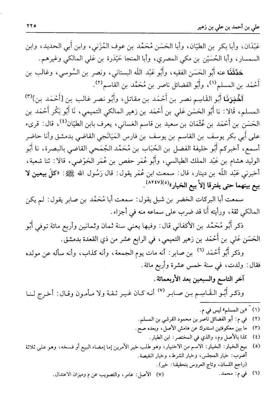 عبدان وأبا بكر بن الطيان وأبا الحسن محمد بن عوف المزني وابن أبي الحديد وابن السمسار وأبا الحسين بن مكي المصري وأبا المنجا حيدرة بن علي المالكي وغيرهم حدثنا عنه أبو الحسن الفقيه وأبو عبد الله البستاني ونصر بن السوسي وغالب بن أحمد بن المسلم (1) وأبو الفضائل ناصر بن محمد بن القاسم (2) أخبرنا أبو القاسم نصر بن أحمد بن مقاتل وأبو نصر غالب بن أحمد بن (3) المسلم قالا نا أبو الحسن علي بن أحمد بن زهير المالكي التميمي نا أبو بكر أحمد بن الحسن بن أحمد بن عثمان بن سعيد بن قاسم الغساني يعرف بابن الطيان (4) قال قرئ على أبي بكر يوسف بن القاسم بن يوسف بن فارس الميانجي القاضي بدمشق وأنا حاضر أسمع أخبركم أبو خليفة الفضل بن الحباب بن محمد الجمحي القاضي بالبصرة نا أبو الوليد هشام بن عبد الملك الطيالسي وأبو عمر حفص بن عمر الحوضي قالا ثنا شعبة أخبرني عبد الله بن دينار قال سمعت ابن عمر يقول قال رسول الله (صلى الله عليه وسلم) كل بيعين لا بيع بينهما حتى يفترقا إلا بيع الخيار (5)