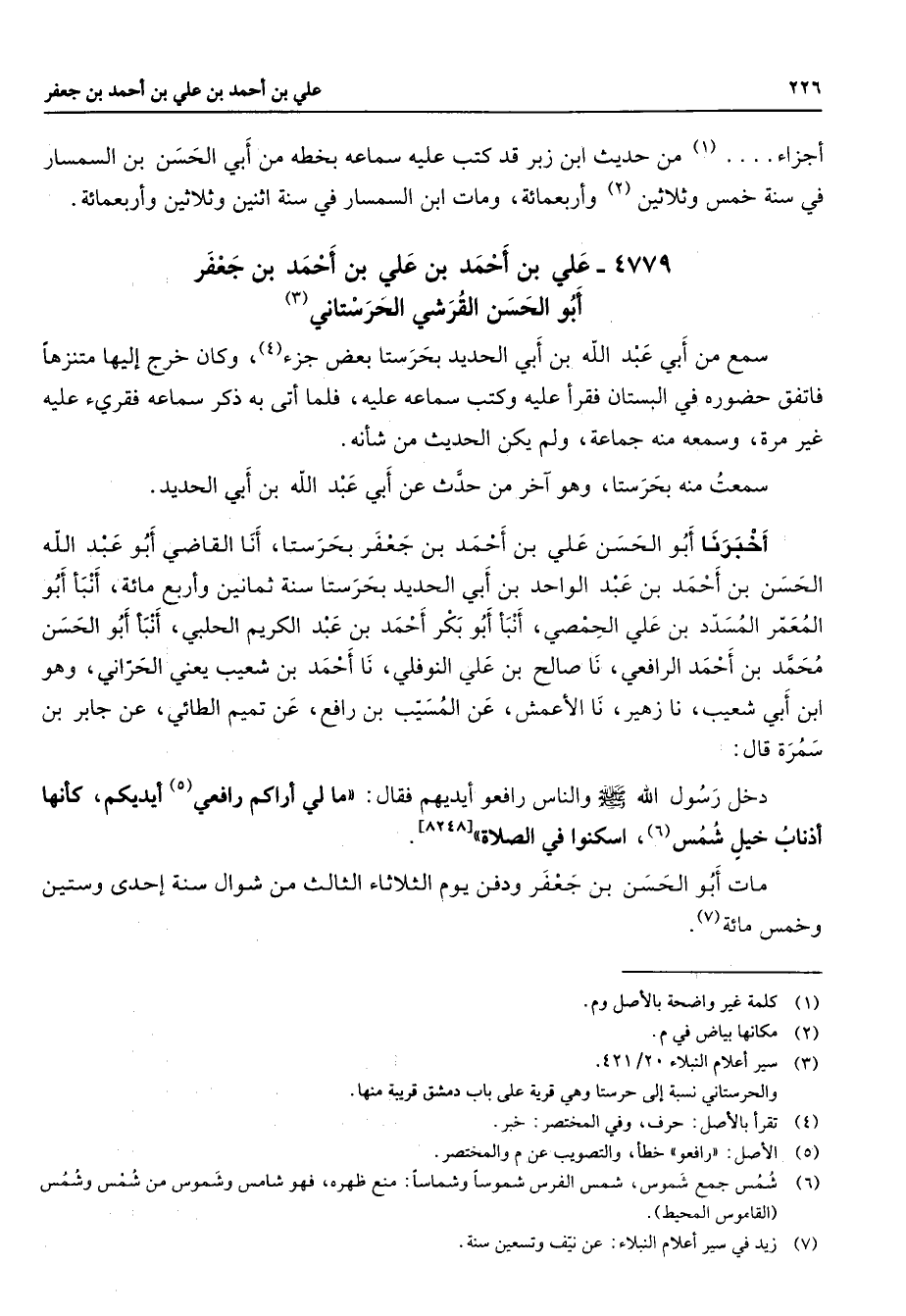 4779 - علي بن أحمد بن علي بن أحمد بن جعفر أبو الحسن القرشي الحرستاني (3) سمع من أبي عبد الله بن أبي الحديد بحرستا بعض جزء (4) وكان خرج إليها متنزها فاتفق حضوره في البستان فقرأ عليه وكتب سماعه عليه فلما أتى به ذكر سماعه فقرئ عليه غير مرة وسمعه منه جماعة ولم يكن الحديث من شأنه سمعت منه بحرستا وهو آخر من حدث عن أبي عبد الله بن أبي الحديد أخبرنا أبو الحسن علي بن أحمد بن جعفر بحرستا أنا القاضي أبو عبد الله الحسن بن أحمد بن عبد الواحد بن أبي الحديد بحرستا سنة ثمانين وأربع مائة أنبأ أبو المعمر المسدد بن علي الحمصي أنبأ أبو بكر أحمد بن عبد الكريم الحلبي أنبأ أبو الحسن محمد بن أحمد الرافعي نا صالح بن علي النوفلي نا أحمد بن شعيب يعني الحراني وهو ابن أبي شعيب نا زهير نا الأعمش عن المسيب بن رافع عن تميم الطائي عن جابر بن سمرة قال دخل رسول الله (صلى الله عليه وسلم) والناس رافعوا أيديهم فقال ما لي أراكم رافعي (5) أيديكم كأنها أذناب خيل شمس (6) اسكنوا في الصلاة