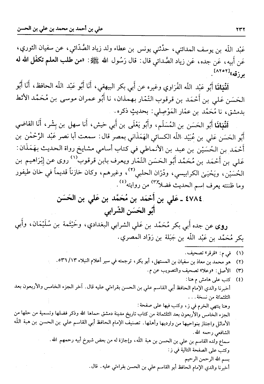 4784 - علي بن أحمد بن محمد بن علي بن الحسن أبو الحسن الشرابي روى عن جده أبي بكر محمد بن علي الشرابي البغدادي وخيثمة بن سليمان وأبي بكر محمد بن عبد الله بن جبلة بن رواد المصري