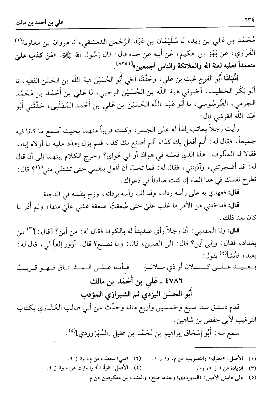 4786 - علي بن أحمد بن مالك أبو الحسن اليزدي ثم الشيرازي المؤدب قدم دمشق سنة سبع وخمسين وأربع مائة وحدث عن أبي طالب العشاري بكتاب الترغيب لأبي حفص بن شاهين سمع منه أبو إسحاق إبراهيم بن محمد بن عقيل السهروردي (5)