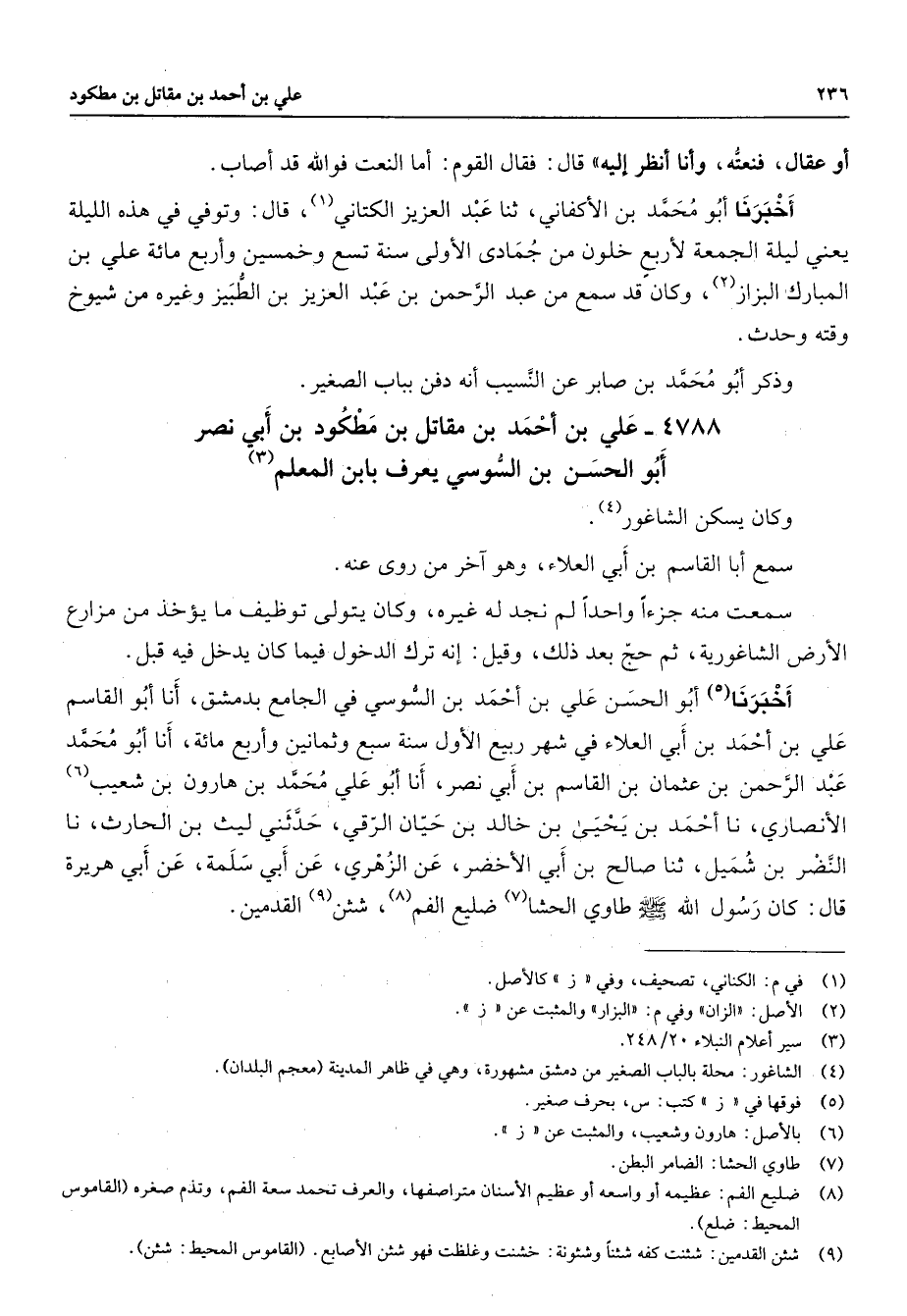 4788 - علي بن أحمد بن مقاتل بن مطكود بن أبي نصر أبو الحسن بن السوسي يعرف بابن المعلم (3) وكان يسكن الشاغور (4) سمع أبا القاسم بن أبي العلاء وهو آخر من روى عنه سمعت منه جزءا واحدا لم نجد له غيره وكان يتولى توظيف ما يؤخذ من مزارع الأرض الشاغورية ثم حج بعد ذلك وقيل إنه ترك الدخول فيما كان يدخل فيه قبل أخبرنا (5) أبو الحسن علي بن أحمد بن السوسي في الجامع بدمشق أنا أبو القاسم علي بن أحمد بن أبي العلاء في شهر ربيع الأول سنة سبع وثمانين وأربع مائة أنا أبو محمد عبد الرحمن بن عثمان بن القاسم بن أبي نصر أنا أبو علي محمد بن هارون بن شعيب (6) الأنصاري نا أحمد بن يحيى بن خالد بن حيان الرقي حدثني ليث بن الحارث نا النضر بن شميل ثنا صالح بن أبي الأخضر عن الزهري عن أبي سلمة عن أبي هريرة قال كان رسول الله (صلى الله عليه وسلم) طاوي الحشا (7) ضليع الفم (8) شثن (9) القدمين