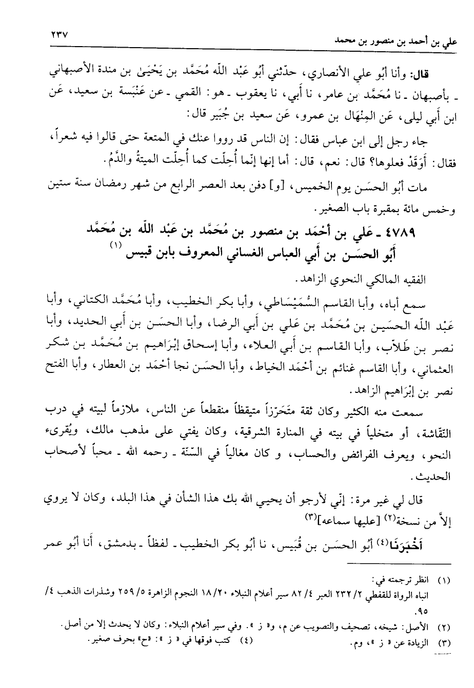 4789 - علي بن أحمد بن منصور بن محمد بن عبد الله بن محمد أبو الحسن بن أبي العباس الغساني المعروف بابن قبيس (1) الفقيه المالكي النحوي الزاهد سمع أباه وأبا القاسم السميساطي وأبا بكر الخطيب وأبا محمد الكتاني وأبا عبد الله الحسين بن محمد بن علي بن أبي الرضا وأبا الحسن بن أبي الحديد وأبا نصر بن طلاب وأبا القاسم بن أبي العلاء وأبا إسحاق إبراهيم بن محمد بن شكر العثماني وأبا القاسم غنائم بن أحمد الخياط وأبا الحسن نجا أحمد بن العطار وأبا الفتح نصر بن إبراهيم الزاهد سمعت منه الكثير وكان ثقة متحرزا متيقظا منقطعا عن الناس ملازما لبيته في درب النقاشة أو متخليا في بيته في المنارة الشرقية وكان يفتي على مذهب مالك ويقرئ النحو ويعرف الفرائض والحساب وكان مغاليا في السنة رحمه الله محبا لأصحاب الحديث قال لي غير مرة إن لأرجو أني يحيى الله بك هذا الشأن في هذا البلد وكان لا يروي إلا من نسخة (2) عليها سماعه (3) أخبرنا (4) أبو الحسن بن قبيس نا أبو بكر الخطيب لفظا بدمشق أنا أبو عمر