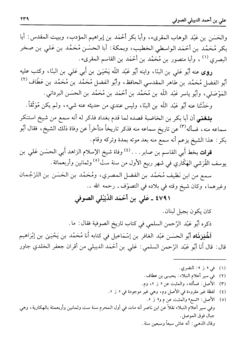 4791 - علي بن أحمد الديبلي الصوفي كان يكون بجبل لبنان ذكره أبو عبد الرحمن السلمي في كتاب تاريخ الصوفية فقال ما أخبرناه أبو الحسن عبد الغافر بن إسماعيل في كتابه أنا محمد بن يحيى بن إبراهيم قال قال أنا أبو عبد الرحمن السلمي علي بن أحمد الديبلي من أقران جعفر الخلدي جاور