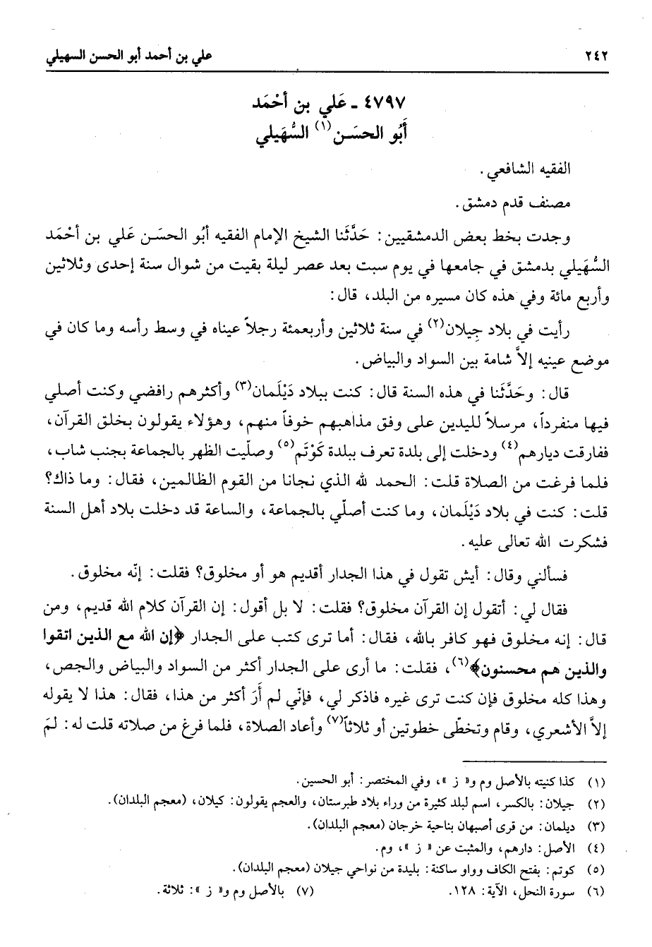 4797 - علي بن أحمد أبو الحسن (1) السهيلي الفقيه الشافعي مصنف قدم دمشق وجدت بخط بعض الدمشقيين حدثنا الشيخ الإمام الفقيه أبو الحسن علي بن أحمد السهيلي بدمشق في جامعها في يوم سبت بعد عصر ليلة بقيت من شوال سنة إحدى وثلاثين وأربع مائة وفي هذه كان مسيره من البلد قال رأيت في بلاد جيلان (2) في سنة ثلاثين وأربعمئة رجلا عيناه في وسط رأسه وما كان في موضع عينيه إلا شامة بين السواد والبياض قال وحدثنا في هذه السنة قال كنت ببلاد ديلمان (3) وأكثرهم رافضي وكنت أصلي فيها منفردا مرسلا لليدين على وفق مذاهبهم خوفا منهم وهؤلاء يقولون بخلق القرآن ففارقت ديارهم (4) ودخلت إلى بلدة تعرف ببلدة كوتم (5) وصليت الظهر بالجماعة بجنب شاب فلما فرغت من الصلاة قلت الحمد لله الذي نجانا من القوم الظالمين فقال وما ذاك قلت كنت في بلاد ديلمان وما كنت أصلي بالجماعة والساعة قد دخلت بلاد أهل السنة فشكرت الله تعالى عليه فسألني وقال أيش تقول في هذا الجدار أقديم هو أو مخلوق فقلت إنه مخلوق فقال لي أتقول إن القرآن مخلوق فقلت لا بل أقول إن القرآن كلام الله قديم ومن قال إنه مخلوق فهو كافر بالله فقال أما ترى كتب على الجدار " إن الله مع الذين اتقوا والذين هم محسنون " (6) فقلت ما أرى على الجدار أكثر من السواد والبياض والجص وهذا كله مخلوق فإن كنت ترى غيره فاذكر لي فإني لم أر أكثر من هذا فقال هذا لا يقوله إلا الأشعري وقام وتخطى خطوتين أو ثلاثا (7) وأعاد الصلاة فلما فرغ من صلاته قلت له لم