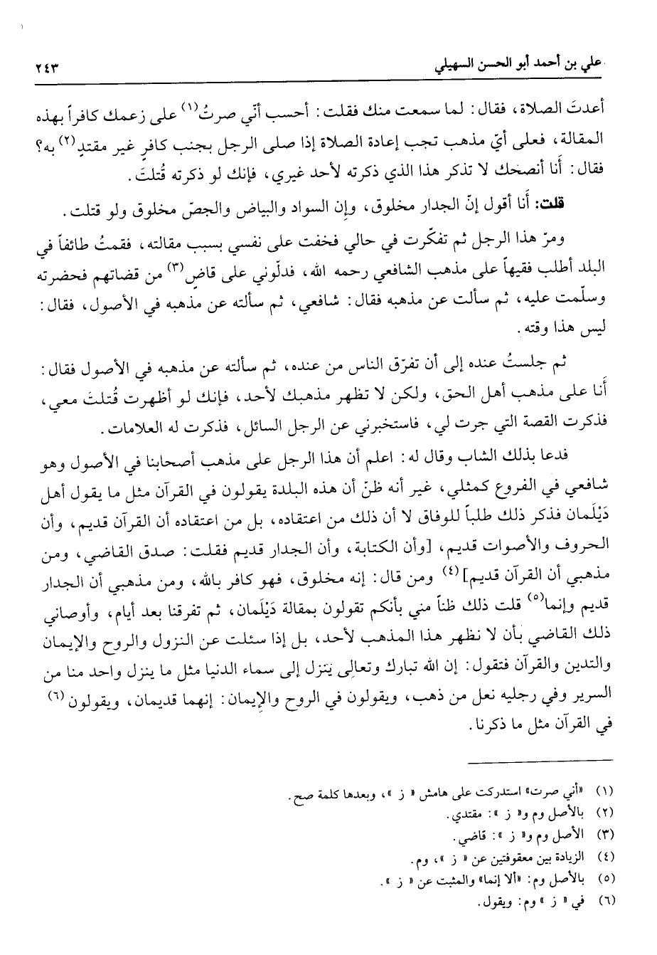 أعدت الصلاة فقال لما سمعت منك فقلت أحسب أني صرت (1) على زعمك كافرا بهذه المقالة فعلى أي مذهب تجب إعادة الصلاة إذا صلى الرجل بجنب كافر غير مقتد (2) به فقال أنا أنصحك لا تذكر هذا الذي ذكرته لأحد غيري فإنك لو ذكرته قتلت قلت أنا أقول إن الجدار مخلوق وإن السواد والبياض والجص مخلوق ولو قتلت ومر هذا الرجل ثم تفكرت في حالي فخفت على نفسي بسبب مقالته فقمت طائفا في البلد أطلب فقيها على مذهب الشافعي رحمه الله فدلوني على قاض (3) من قضاتهم فحضرته وسلمت عليه ثم سألت عن مذهبه فقال شافعي ثم سألته عن مذهبه في الأصول فقال ليس هذا وقته ثم جلست عنده إلى أن تفرق الناس من عنده ثم سألته عن مذهبه في الأصول فقال أنا على مذهب أهل الحق ولكن لا تظهر مذهبك لأحد فإنك لو أظهرت قتلت معي فذكرت القصة التي جرت لي فاستخبرني عن الرجل السائل فذكرت له العلامات فدعا بذلك الشاب وقال له اعلم أن هذا الرجل على مذهب أصحابنا في الأصول وهو شافعي في الفروع كمثلي غير أنه ظن أن هذه البلدة يقولون في القرآن مثل ما يقول أهل ديلمان فذكر ذلك طلبا للوفاق لا أن ذلك من اعتقاده بل من اعتقاده أن القرآن قديم وأن الحروف والأصوات قديم وأن الكتابة وأن الجدار قديم فقلت صدق القاضي ومن مذهبي ان القرآن قديم (4) ومن قال إنه مخلوق فهو كافر بالله ومن مذهبي أن الجدار قديم وإنما (5) قلت ذلك ظنا مني بأنكم تقولون بمقالة ديلمان ثم تفرقنا بعد أيام وأوصاني ذلك القاضي بأن لا نظهر هذا المذهب لأحد بل إذا سئلت عن النزول والروح والإيمان والتدين والقرآن فتقول إن الله تبارك وتعالى ينزل إلى سماء الدنيا مثل ما ينزل واحد منا من السرير وفي رجليه نعل من ذهب ويقولون في الروح والإيمان إنهما قديمان ويقولون (6) في القرآن مثل ما ذكرنا
