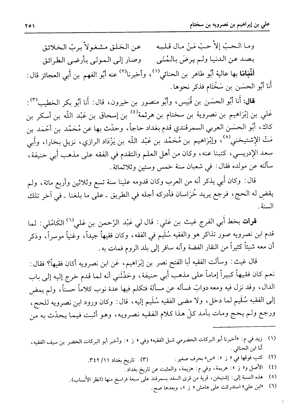 وما الحب إلا حب من مال قلبه * عن الخلق مشغولا برب الخلائق يصد عن الدنيا ولم يرض بالمنى * وصار إلى المولى بأرضى الطرائق أنبأنا بها عالية أبو طاهر بن الحنائي (1) وأخبرنا (2) عنه أبو الفهم بن أبي العجائز قال أنا أبو الحسن بن سختام فذكر نحوها قال أنا أبو الحسن بن قبيس وأبو منصور بن خيرون قال أنا أبو بكر الخطيب (3) علي بن إبراهيم بن نصروية بن سختام بن هرثمة (4) بن إسحاق بن عبد الله بن أسكر بن كاك أبو الحسن العربي السمرقندي قدم بغداد حاجا وحدث بها عن محمد بن أحمد بن مت الإشتيخني (5) وإبراهيم بن محمد بن عبد الله بن يزداد الرازي نزيل بخارا وأبي سعد الإدريسي كتبنا عنه وكان من أهل العلم والتقدم في الفقه على مذهب أبي حنيفة سألته عن مولده فقال في شعبان سنة خمس وستين وثلاثمائة قال وكان أبي يذكر أنه من العرب وكان قدومه علينا سنة تسع وثلاثين وأربع مائة ولم يقض له الحج فرجع يريد خراسان فأدركه أجله في الطريق على ما بلغنا في آخر تلك السنة قرأت بخط أبي الفرج غيث بن علي قال لي عبد الرحمن بن علي (6) الكاملي لما قدم ابن نصرويه صور تذاكر هو والفقيه سليم في الفقه وكان فقيها جيدا وغنيا موسرا وذكر أن معه شيئا كثيرا من النقار الفضة وأنه سافر إلى بلد الروم فمات به قال غيث وسألت الفقيه أبا الفتح نصر بن إبراهيم عن ابن نصرويه أكان فقيها فقال نعم كان فقيها كبيرا إماما على مذهب أبي حنيفة وحدثني أنه لما قدم خرج إليه إلى باب الدال وقد نزل فيه ومعه دواب فسأله عن مسألة فتكلم فيها عدة نوب كلاما حسنا ولم يمض إلى الفقيه سليم لما دخل ولا مضى الفقيه سليم إليه قال وكان ورود ابن نصرويه للحج ورجع ولم يحج ومات بآمد كل هذا كلام الفقيه نصرويه وهو أثبت فيما يحدث به من