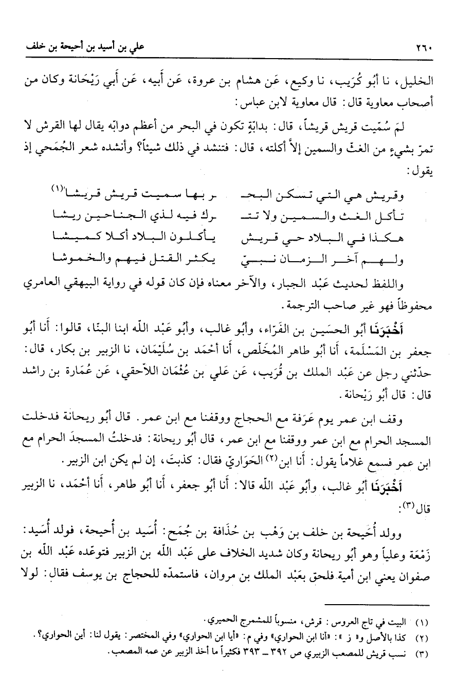الخليل نا أبو كريب نا وكيع عن هشام بن عروة عن أبيه عن أبي ريحانة وكان من أصحاب معاوية قال قال معاوية لابن عباس لم سميت قريش قريشا قال بدابة تكون في البحر من أعظم دوابه يقال لها القرش لا تمر بشئ من الغث والسمين إلا أكلته قال فتنشد في ذلك شيئا وأنشده شعر الجمحي إذ يقول * وقريش هي التي تسكن البح * ر بها سميت قريش قريشا (1) تأكل الغث والسمين ولا تت * رك فيه لذي الجناحين ريشا هكذا في البلاد حي قريش * يأكلون البلاد أكلا كميشا ولهم آخر الزمان نبي * يكثر القتل فيهم والخموشا * واللفظ لحديث عبد الجبار والآخر معناه فإن كان قوله في رواية البيهقي العامري محفوظا فهو غير صاحب الترجمة أخبرنا أبو الحسين بن الفراء وأبو غالب وأبو عبد الله ابنا البنا قالوا أنا أبو جعفر بن المسلمة أنا أبو طاهر المخلص أنا أحمد بن سليمان نا الزبير بن بكار قال حدثني رجل عن عبد الملك بن قريب عن علي بن عثمان اللاحقي عن عمارة بن راشد قال قال أبو ريحانة وقف ابن عمر يوم عرفة مع الحجاج ووقفنا مع ابن عمر قال أبو ريحانة فدخلت المسجد الحرام مع ابن عمر ووقفنا مع ابن عمر قال أبو ريحانة فدخلت المسجد الحرام مع ابن عمر فسمع غلاما يقول أنا ابن (2) الحواري فقال كذبت إن لم يكن ابن الزبير أخبرنا أبو غالب وأبو عبد الله قالا أنا أبو جعفر أنا أبو طاهر أنا أحمد نا الزبير قال (3) وولد أحيحة بن خلف بن وهب بن حذافة بن جمح أسيد بن أحيحة فولد أسيد زمعة وعليا وهو أبو ريحانة وكان شديد الخلاف على عبد الله بن الزبير فتوعده عبد الله بن صفوان يعني ابن أمية فلحق بعبد الملك بن مروان فاستمده للحجاج بن يوسف فقال لولا