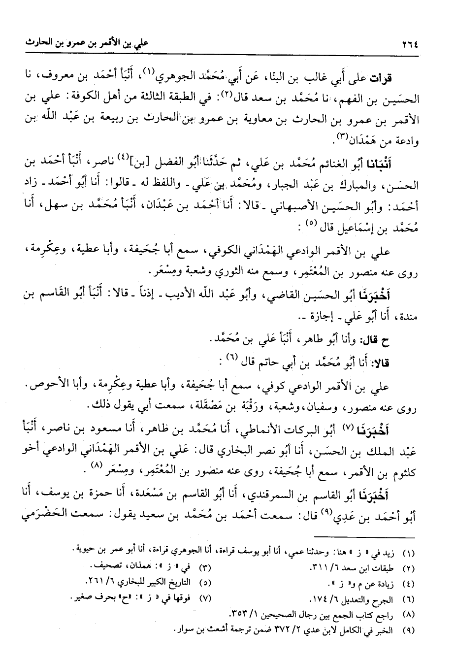 قرأت على أبي غالب بن البنا عن أبي محمد الجوهري (1) أنبأ أحمد بن معروف نا الحسين بن الفهم نا محمد بن سعد قال (2) في الطبقة الثالثة من أهل الكوفة علي بن الأقمر بن عمرو بن الحارث بن معاوية بن عمرو بن الحارث بن ربيعة بن عبد الله بن وادعة من همدان (3) أنبأنا أبو الغنائم محمد بن علي ثم حدثنا أبو الفضل بن (4) ناصر أنبأ أحمد بن الحسن والمبارك بن عبد الجبار ومحمد بن علي واللفظ له قالوا أنا أبو أحمد زاد أحمد وأبو الحسين الأصبهاني قالا أنا أحمد بن عبدان أنبأ محمد بن سهل أنا محمد بن إسماعيل قال (5) علي بن الأقمر الوادعي الهمداني الكوفي سمع أبا جحيفة وأبا عطية وعكرمة روى عنه منصور بن المعتمر وسمع منه الثوري وشعبة ومسعر أخبرنا أبو الحسين القاضي وأبو عبد الله الأديب إذنا قالا أنبأ أبو القاسم بن مندة أنا أبو علي إجازة ح قال وأنا أبو طاهر أنبأ علي بن محمد قالا أنا أبو محمد بن أبي حاتم قال (6) علي بن الأقمر الوادعي كوفي سمع أبا جحيفة وأبا عطية وعكرمة وأبا الأحوص روى عنه منصور وسفيان وشعبة ورقبة بن مصقلة سمعت أبي يقول ذلك أخبرنا (7) أبو البركات الأنماطي أنا محمد بن طاهر أنا مسعود بن ناصر أنبأ عبد الملك بن الحسن أنا أبو نصر البخاري قال علي بن الأقمر الهمداني الوادعي أخو كلثوم بن الأقمر سمع أبا جحيفة روى عنه منصور بن المعتمر ومسعر (8) أخبرنا أبو القاسم بن السمرقندي أنا أبو القاسم بن مسعدة أنا حمزة بن يوسف أنا أبو أحمد بن عدي (9) قال سمعت أحمد بن محمد بن سعيد يقول سمعت الحضرمي