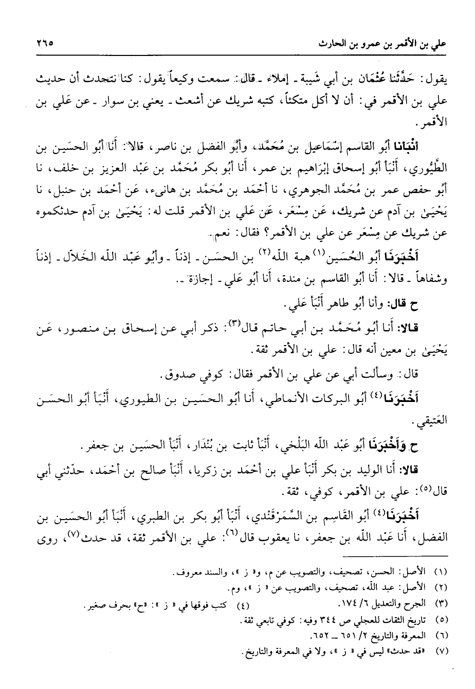 يقول حدثنا عثمان بن أبي شيبة إملاء قال سمعت وكيعا يقول كنا نتحدث أن حديث علي بن الأقمر في أن لا أكل متكئا كتبه شريك عن أشعث يعني بن سوار عن علي بن الأقمر أنبأ أبو القاسم إسماعيل بن محمد وأبو الفضل بن ناصر قالا أنا أبو الحسين بن الطيوري أنبأ أبو إسحاق إبراهيم بن عمر أنا أبو بكر محمد بن عبد العزيز بن خلف نا أبو حفص عمر بن محمد الجوهري نا أحمد بن محمد بن هانئ عن أحمد بن حنبل نا يحيى بن آدم عن شريك عن مسعر عن علي بن الأقمر قلت له يحيى بن آدم حدثكموه عن شريك عن مسعر عن علي بن الأقمر فقال نعم أخبرنا أبو الحسين (1) هبة الله (2) بن الحسن إذنا وأبو عبد الله الخلال إذنا وشفاها قالا أنا أبو القاسم بن مندة أنا أبو علي إجازة ح قال وأنا أبو طاهر أنبأ علي قالا أنا أبو محمد بن أبي حاتم قال (3) ذكر أبي عن إسحاق بن منصور عن يحيى بن معين أنه قال علي بن الأقمر ثقة قال وسألت أبي عن علي بن الأقمر فقال كوفي صدوق أخبرنا (4) أبو البركات الأنماطي أنا أبو الحسين بن الطيوري أنبأ أبو الحسن العتيقي ح وأخبرنا أبو عبد الله البلخي أنبأ ثابت بن بندار أنبأ الحسين بن جعفر قالا أنا الوليد بن بكر أنبأ علي بن أحمد بن زكريا أنبأ صالح بن أحمد حدثني أبي قال علي بن الأقمر كوفي ثقة أخبرنا (4) أبو القاسم بن السمرقندي أنبأ أبو بكر بن الطبري أنبأ أبو الحسين بن الفضل أنا عبد الله بن جعفر نا يعقوب قال (6) علي بن الأقمر ثقة قد حدث (7) روى